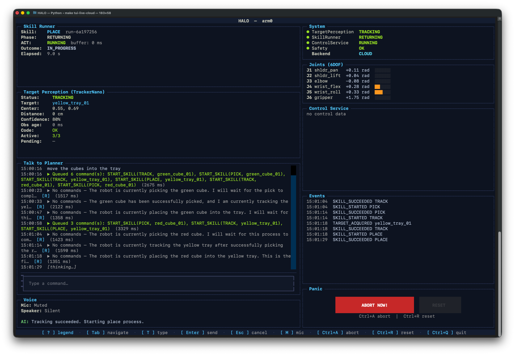We wanted a middle path: a live multimodal robot agent that keeps moving while the AI thinks, while still supporting natural voice interaction and explicit task planning. That led us to build HALO — Hierarchical Adaptive LLM-Operated Robot — a manipulation system that separates conversation, planning, and perception from real-time control.