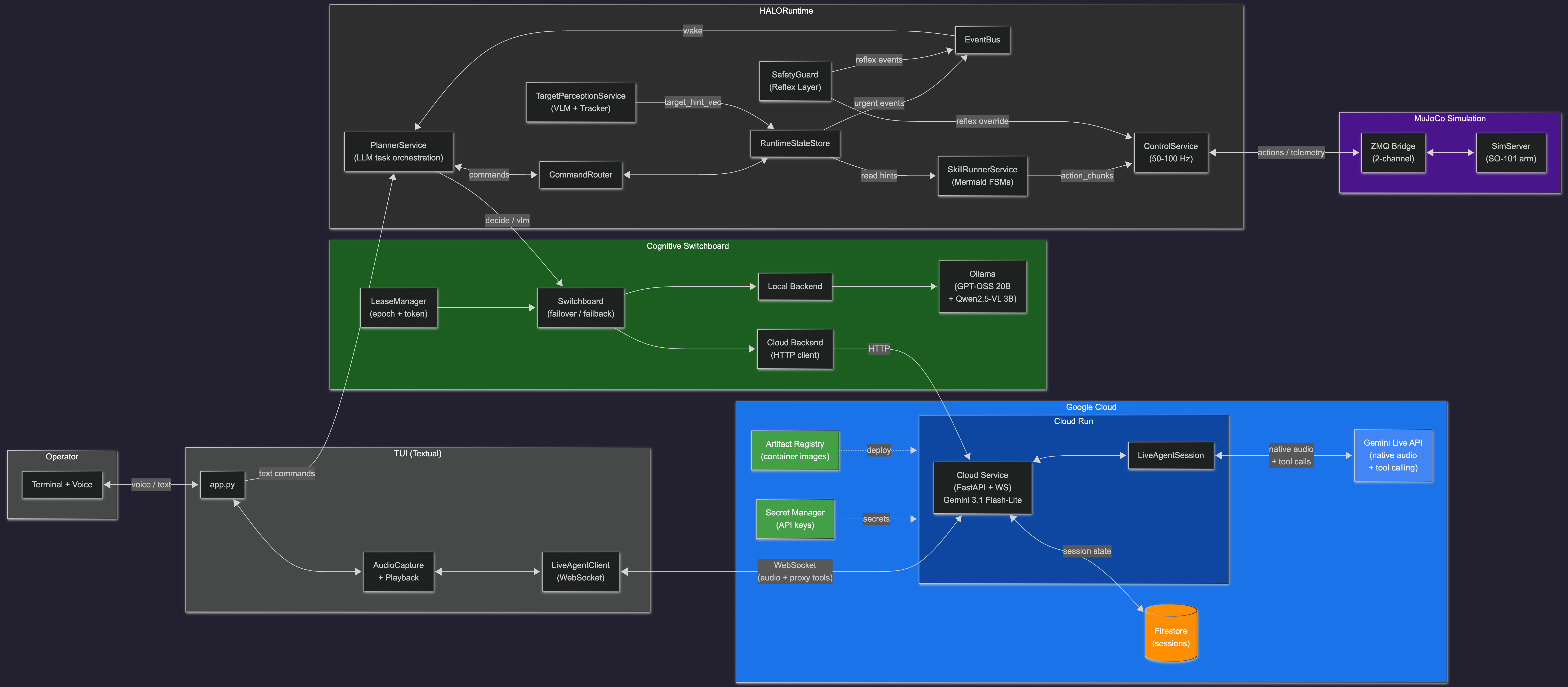 Instead of treating the robot as a single prompt loop, HALO splits its brain into three parts: