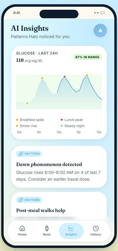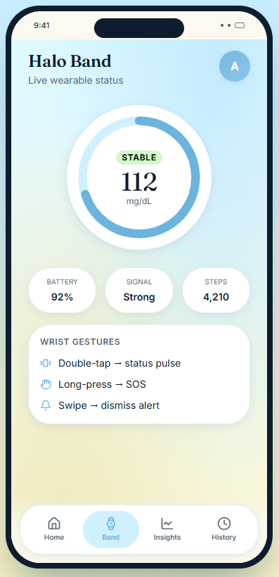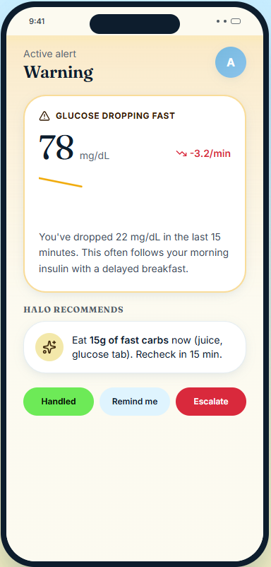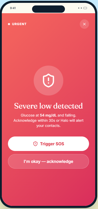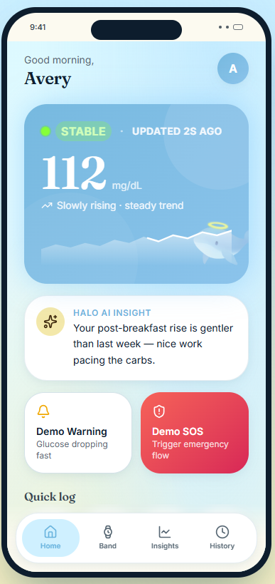 HaloFlow is an AI-powered diabetes support system that combines a smart wrist wearable with a mobile app. The wearable tracks glucose-related signals, blood pressure context, and movement, then communicates what matters through gentle vibrations, light cues, and urgent alerts when needed. The app acts as the brain, classifying your state as Stable, Watch, Warning, or Urgent. It explains what is happening in simple language and suggests what to do next. If things get serious, HaloFlow can trigger an SOS, notify trusted contacts, and step in as a coordinated safety system instead of just another noisy tracker. TLDR; HaloFlow skit.