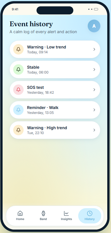 We started by mapping key user journeys like setup, warning moments, and SOS escalation. From there, we designed a mobile-first app with an ocean-inspired look using deep blues, soft gradients, rounded cards, and a calm whale mascot to make everything feel more reassuring and less clinical. On the product side, we focused on building a connected system. A wearable that monitors signals and provides subtle feedback, paired with an app that uses AI to interpret and classify user states. For the hackathon, we focused on prototyping the core UI, alert logic, wearable interaction model, and emergency flow.