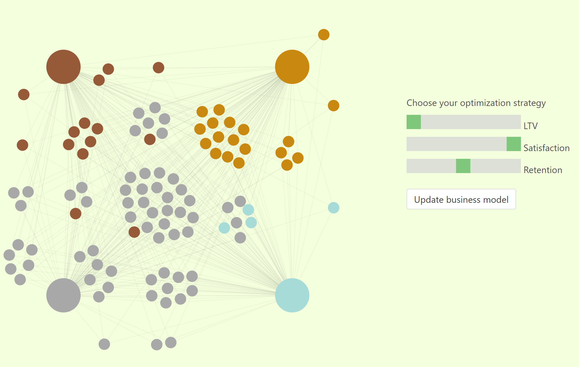 Hank also provides an insurance provider facing visualization that allows for the life insurance provider to tweak Hank's suggestions based on business metrics such as life time value (LTV), customer satisfaction, and customer retention, all without re-training the two machine learning models that Hank uses to provide suggestions.