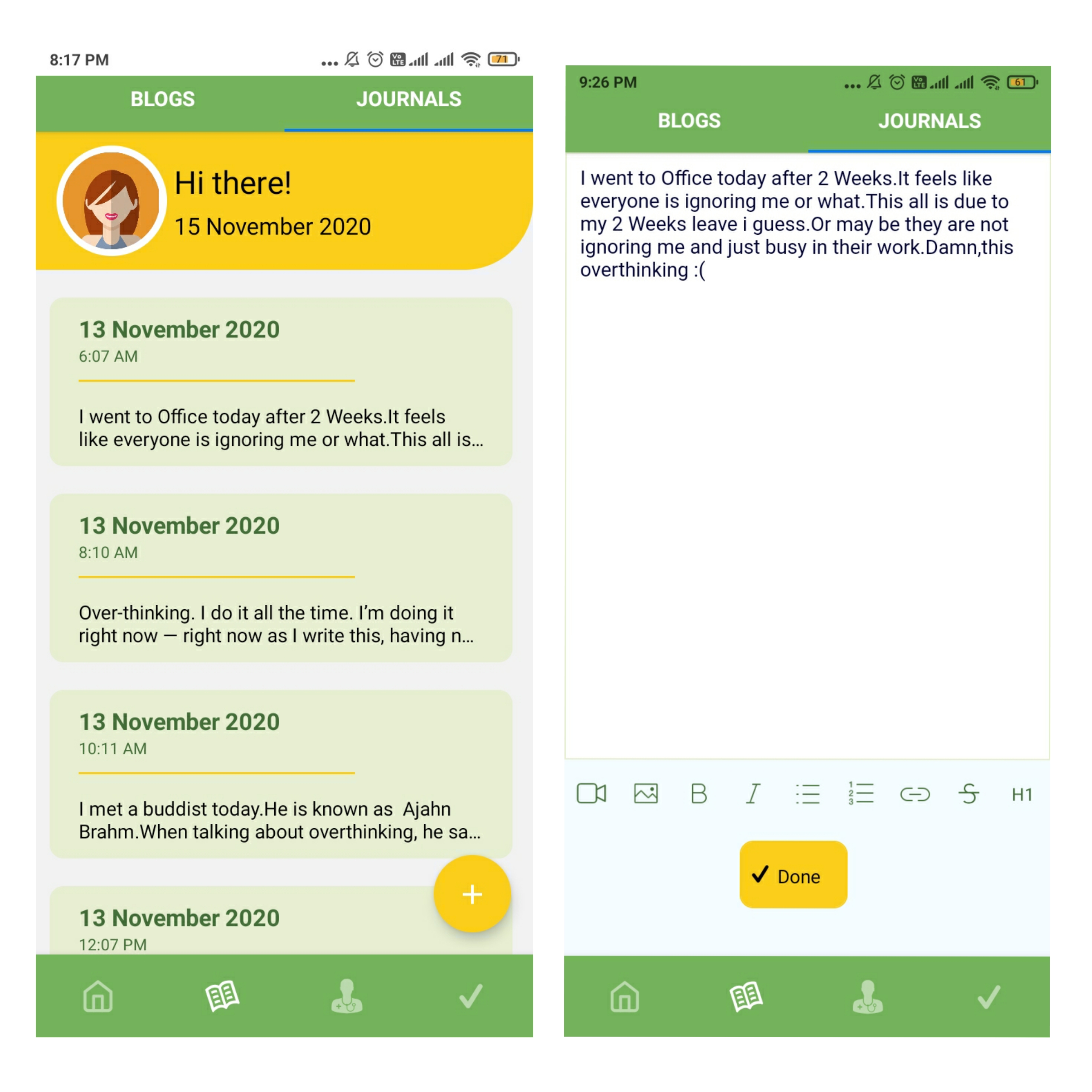 - Journals: Maintain your personal diary. This feature is accessible offline. See a list of your stories sorted by date. Click on any item to edit it or click on the ‘+’ button to write a new one.
