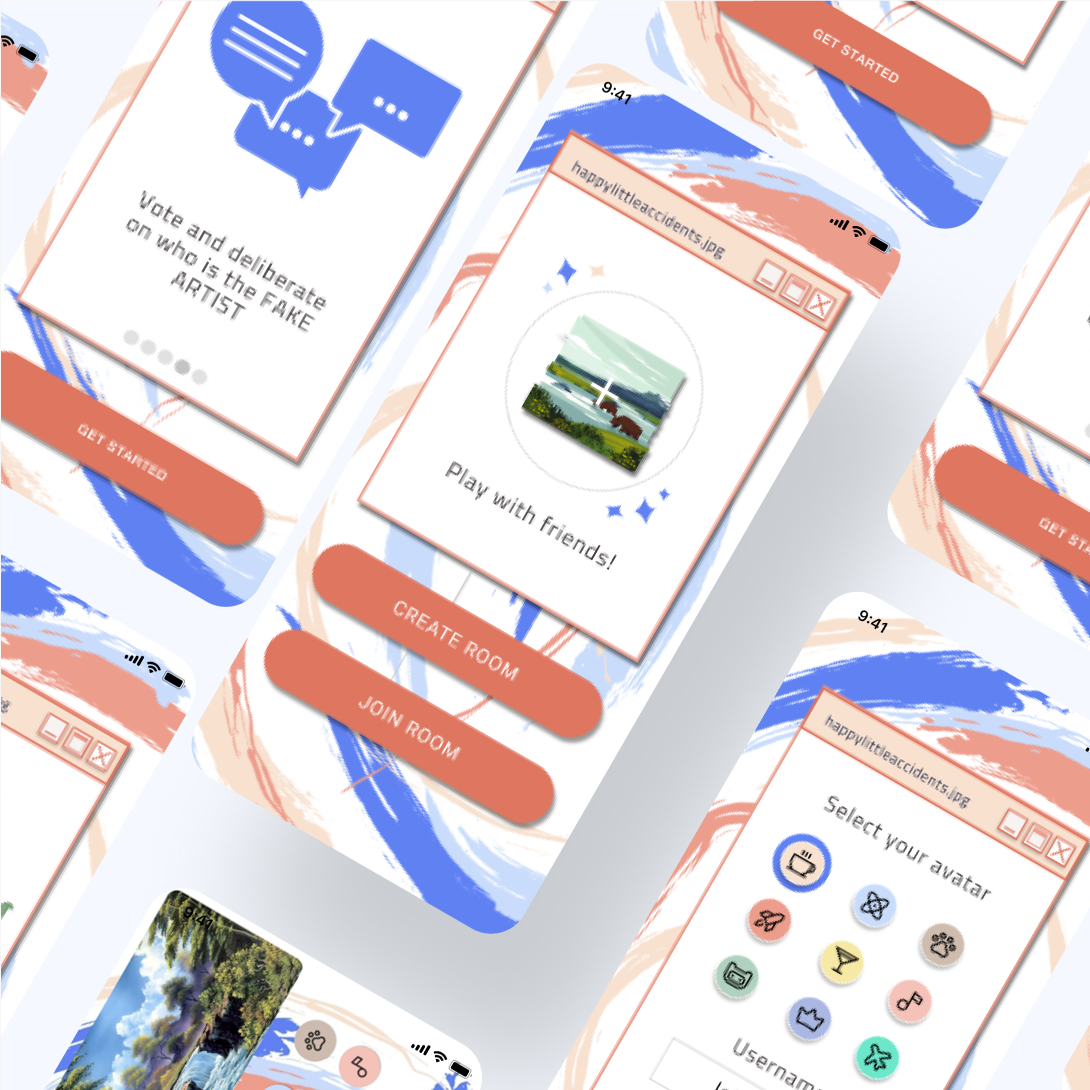 Happy Lil Accidents is an iOS and Android app which allows users to explore their creative and competitive side. In Happy Lil Accidents, the host creates a "Room" for up to 9 people and a unique key is generated, which the host can share for others to join the game. A Bob Ross painting is generated for the users to take turns to paint. One user does not have the painting visible and is the imposter. It is up to all the other user's to determine who is painting incorrectly and who is just not artistically inclined.