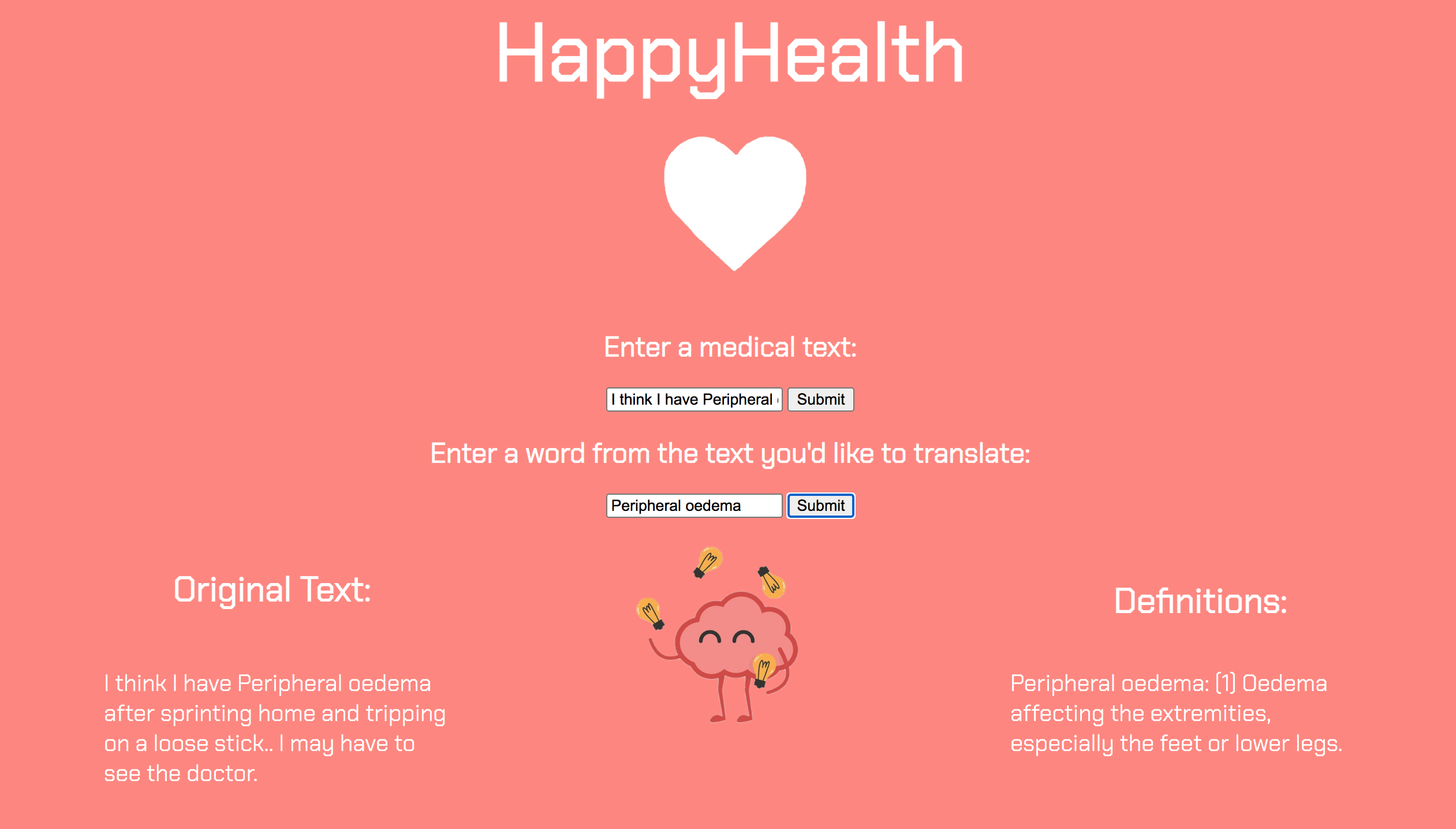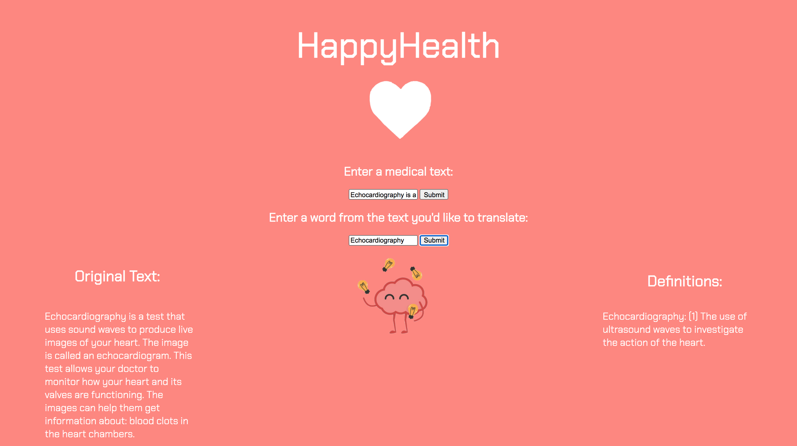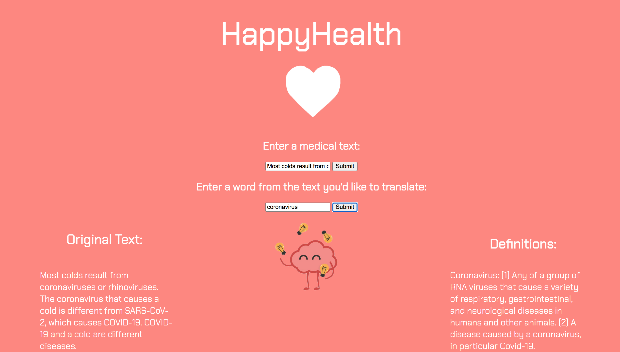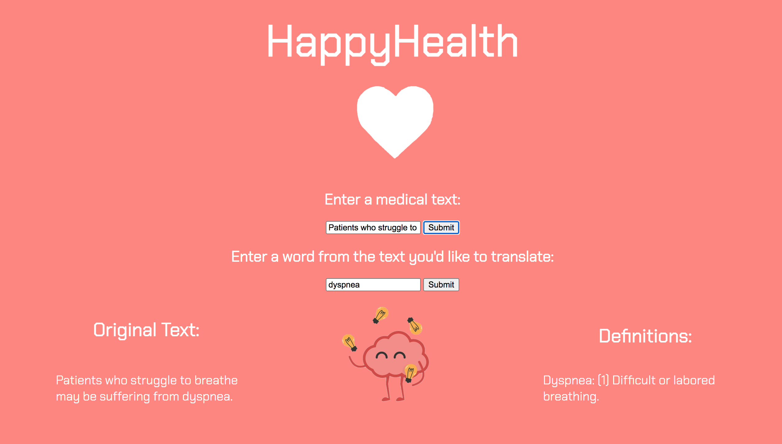 We are really excited about our future plans for HappyHealth! While we still need to build a foundation for our skills, we are looking forward to adding both text and PDF files to be scanned and translated. With this, our program can identify medical jargon or advanced terms and output them with their definitions and examples as a list to the user. Also, we realized that users could input any term to acquire their definitions, even if it was non-medical, so maybe we should stick to medical-only terms next time. :)