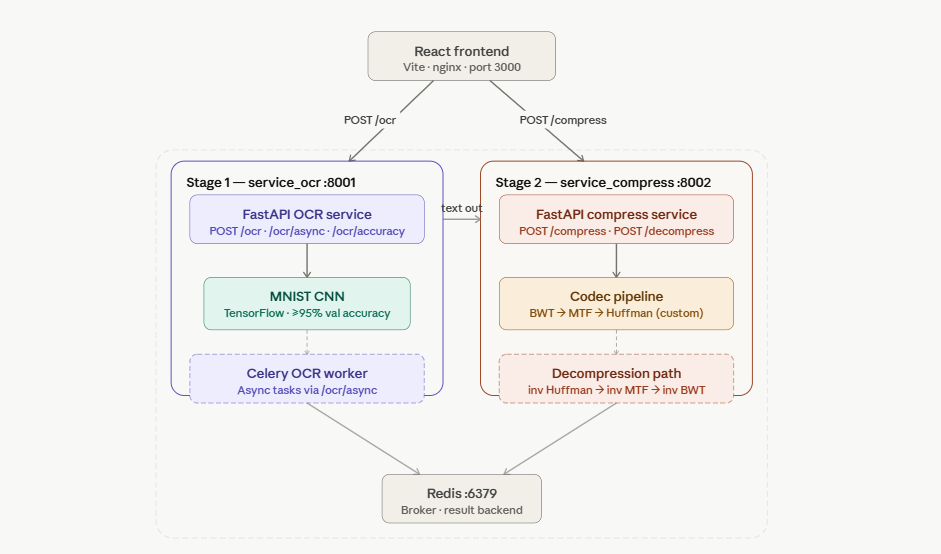 Imagine you're a doctor in a rural clinic. No internet. No cloud. A patient hands you a piece of paper — handwritten prescription notes from another doctor. You need to store it digitally, send it over a low-bandwidth connection, and make sure not a single word gets lost. You can't just take a photo and upload it — the file's too big. You can't type it out manually — too slow, too error-prone. And you definitely can't afford to lose data when someone's health is on the line. That's the problem we set out to solve. What if a machine could read that handwritten note for you, and then compress it so efficiently that you could send it anywhere — even over the worst connection — and reconstruct it perfectly on the other end? That's exactly what we built. You upload a photo of handwritten text. Our AI reads it. Then our custom compressor shrinks it. You get back the compressed blob, and if you decompress it, you get the exact original text back — not one character different. All in under a second.