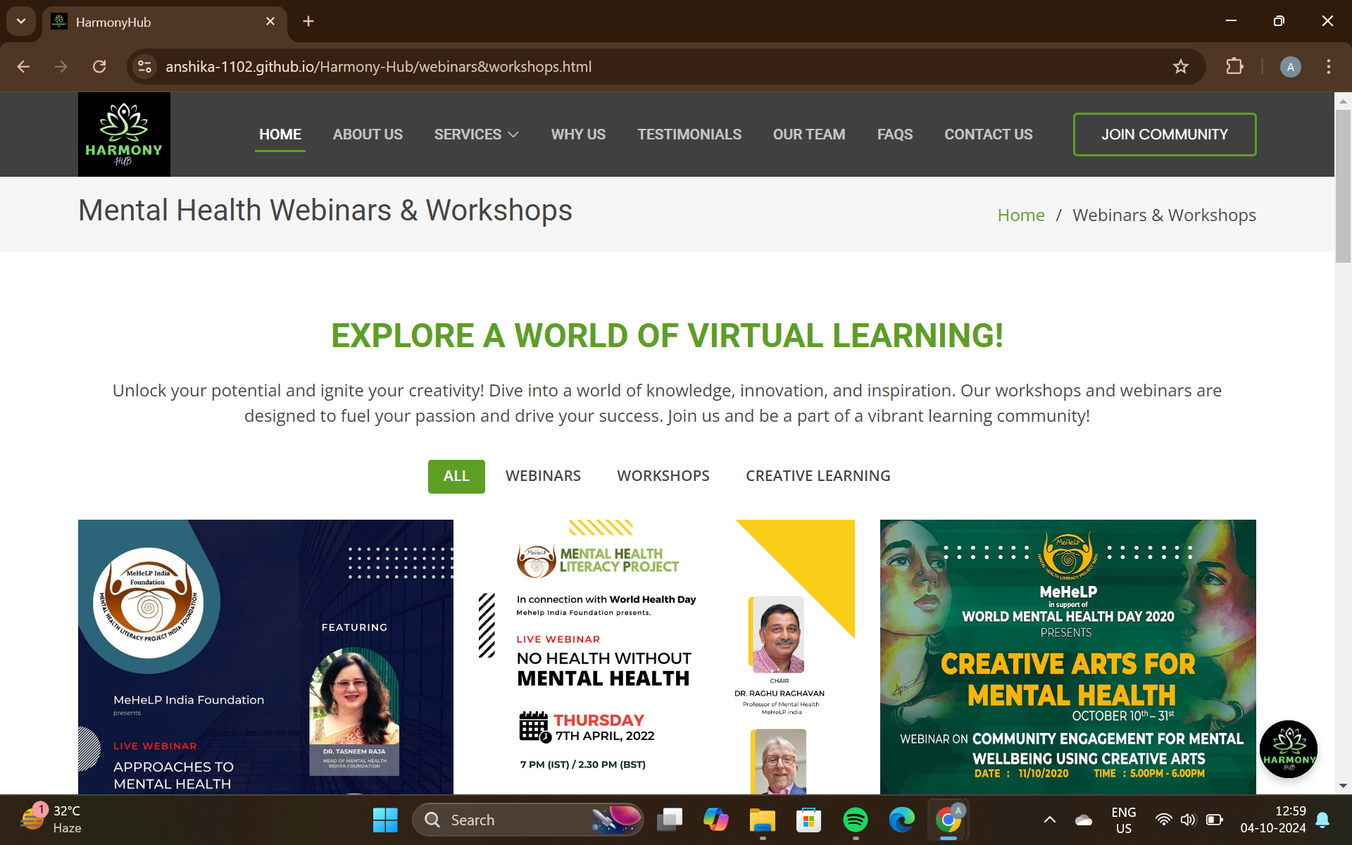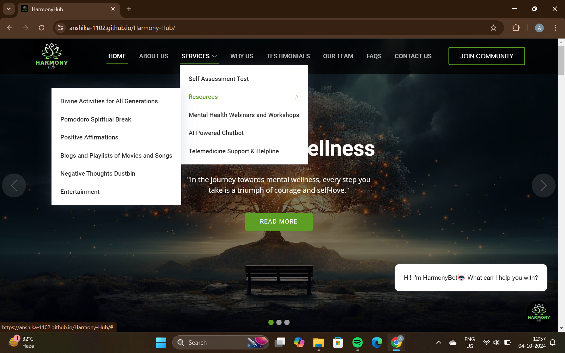HarmonyHub serves as a comprehensive digital sanctuary for mental health and well-being. The platform offers a variety of resources, including: