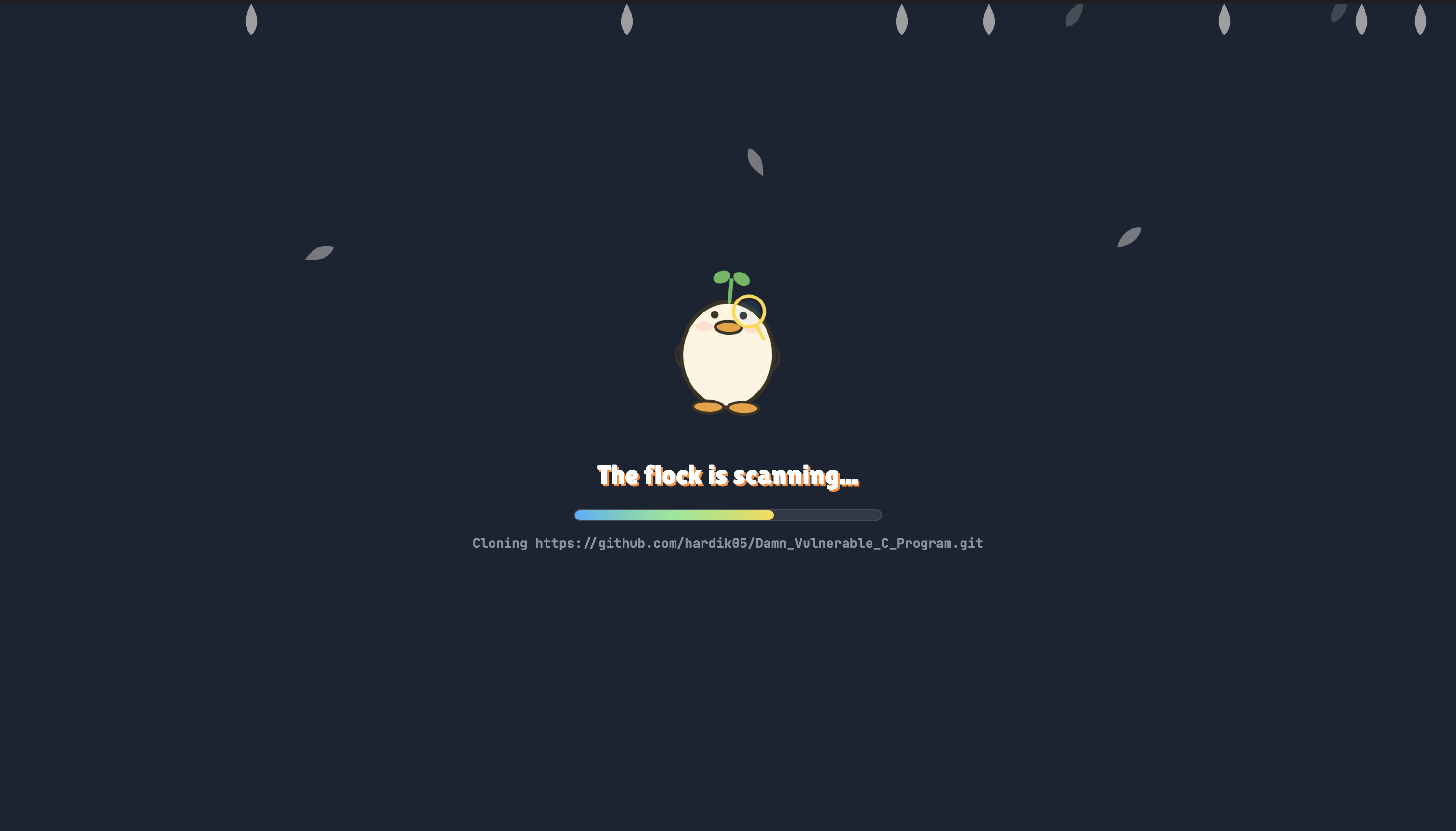 The front-end and back-end communicate utilizing Python’s FastAPI. On an initial scan, the user enters a GitHub repository that is then sanitized by the front-end. After all sanitization is done, the URL gets passed to the back-end and the front-end changes to the loading screen. During the loading screen, the front-end keeps pinging a status file which is dynamically updated by the back-end. The status file contains context for what the back-end is currently doing, such as scanning snippets or chunks, allowing the user to gain a view into how the analysis is happening.