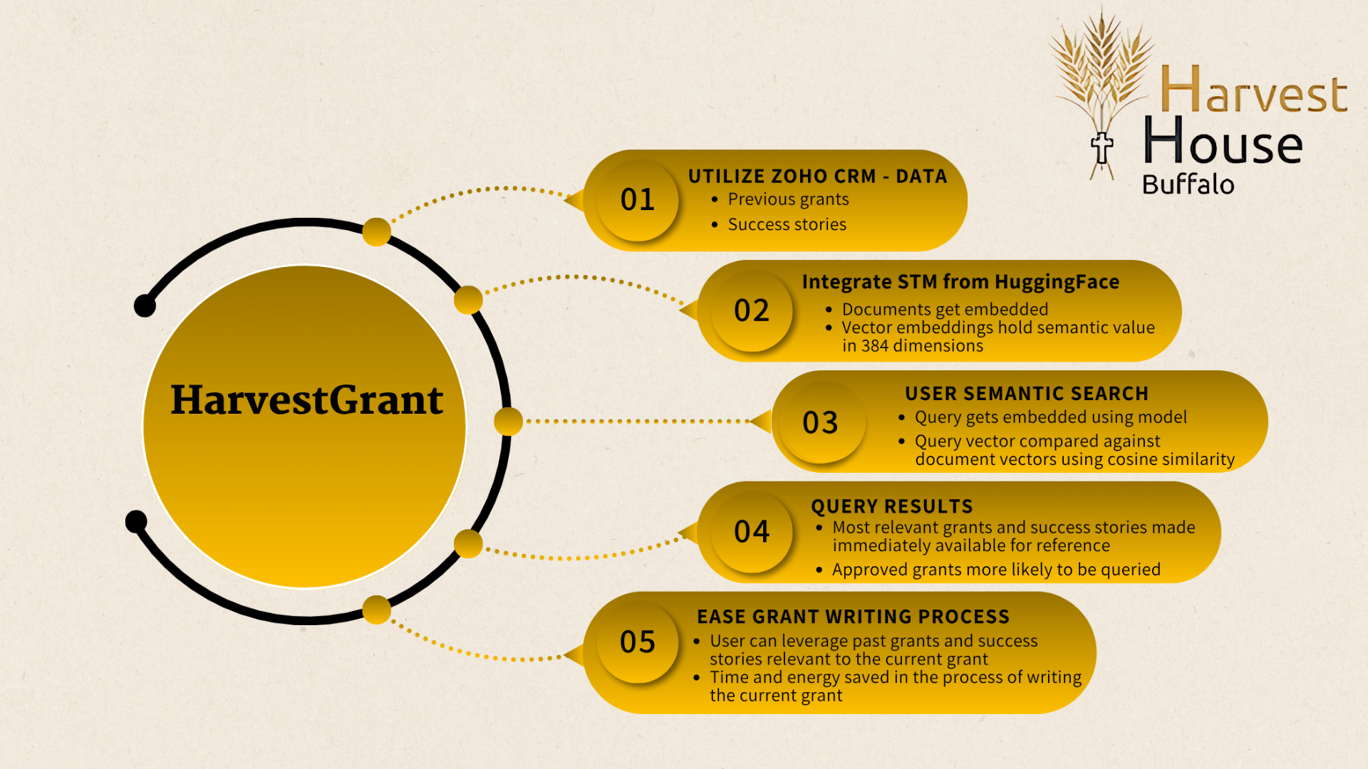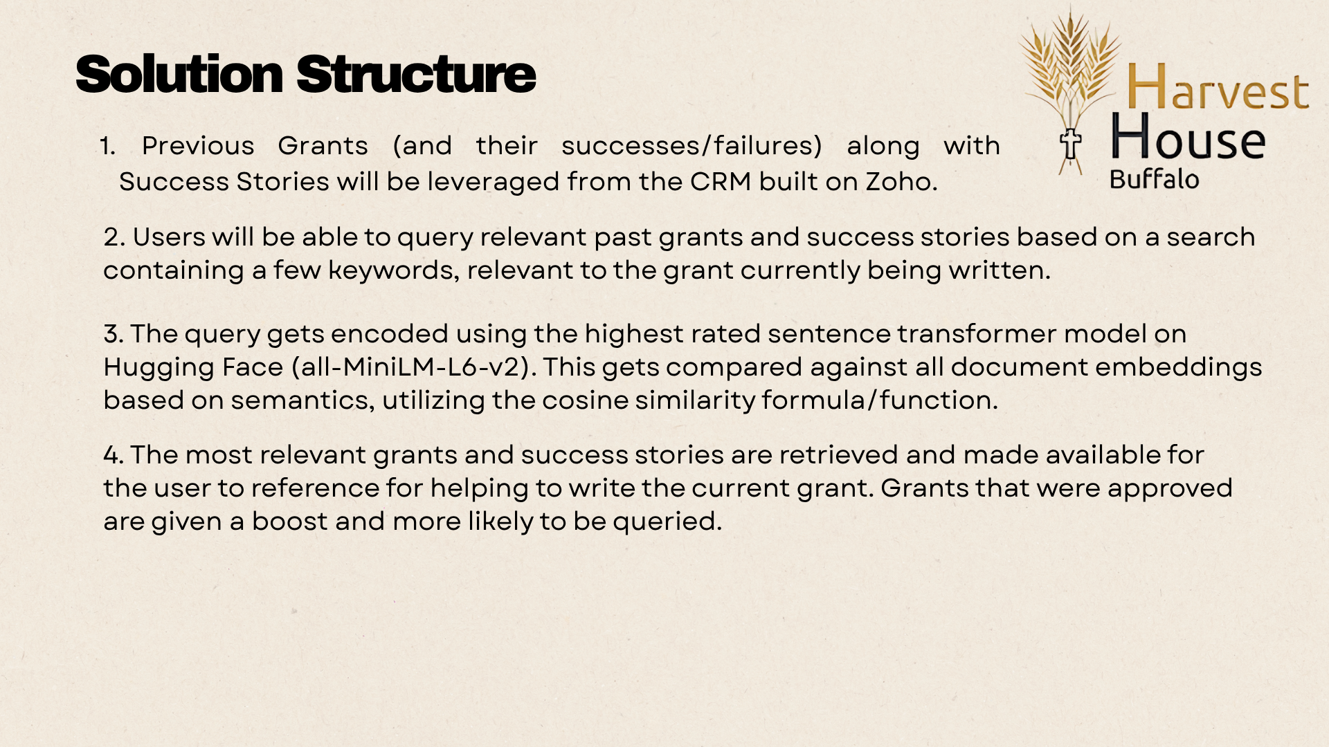The tool utilizes a sentence transformer model. It will translate previous grants and success stories into vector embeddings. This will allow for semantic search of these documents so the user can query relevant past grants and success stories for the grant being currently written.