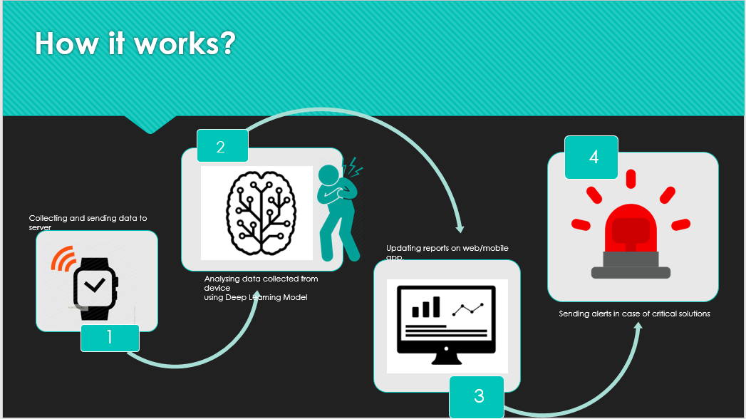 Before this, there was no such device or mechanism for timely (less than and up to 6 hours prior) diagnosis of forthcoming cardiac arrest and no mechanism for timely notification to care giver after diagnosis. All prevailing wearable devices either prognose the attack more than 6 hours prior and are extremely expensive for an average Pakistani consumer to buy and use. Our product will not only help prognose the device earlier than any other device in the market but it will also be cost effective and fully functional with results accurate up to 85%