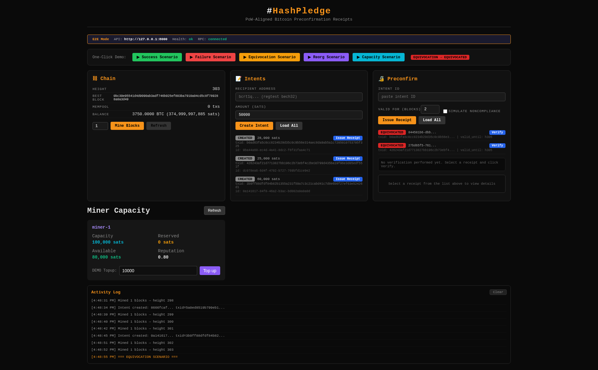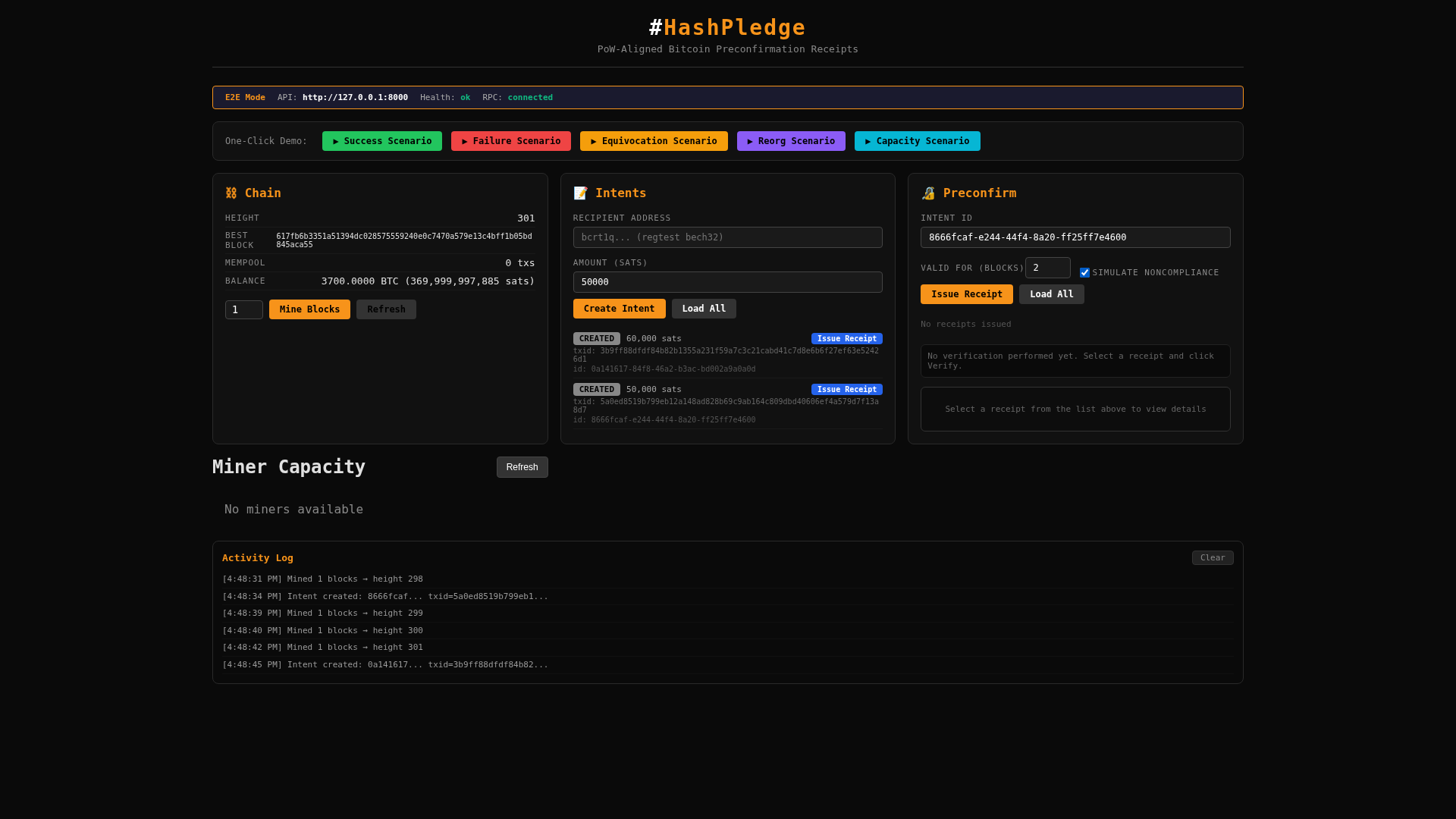 A React + TypeScript UI drives five deterministic scenarios (success, failure, equivocation, reorg, capacity exhaustion) using only data-testid selectors for testability.
