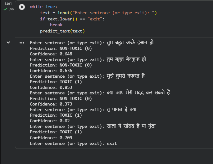 One of the biggest challenges was handling multilingual and informal text, especially Hinglish (mixed Hindi-English). Another issue was reducing false positives on polite or positive sentences, where the model sometimes misclassified neutral phrases as toxic. Balancing precision and recall was also critical.