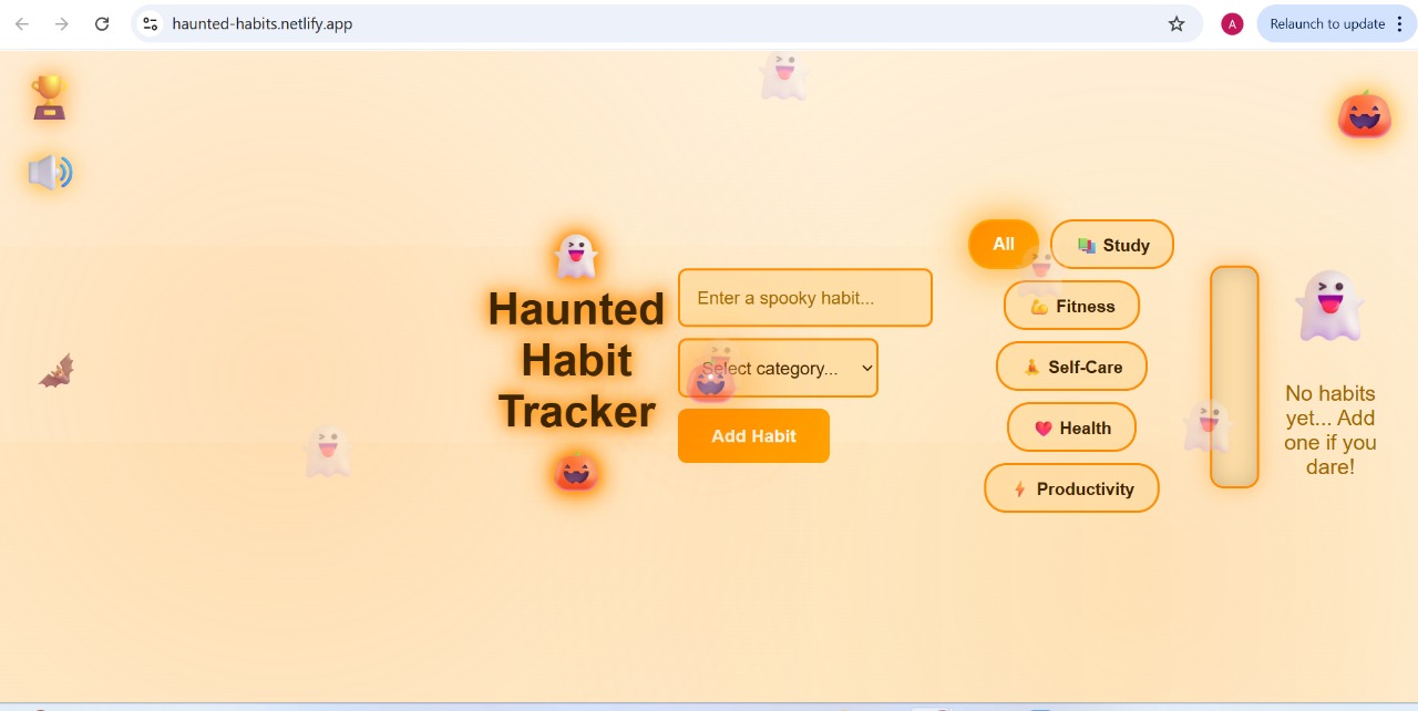 I wanted to build a habit-tracking app that didn’t feel boring or repetitive. Since this hackathon’s theme is Kiroween, I thought—what if building good habits felt spooky, fun, animated, and alive? That idea led to Haunted Habit Tracker: a Halloween-themed productivity tool with floating ghosts, fog, bats, glowing UI, sound effects, achievements, and streaks.