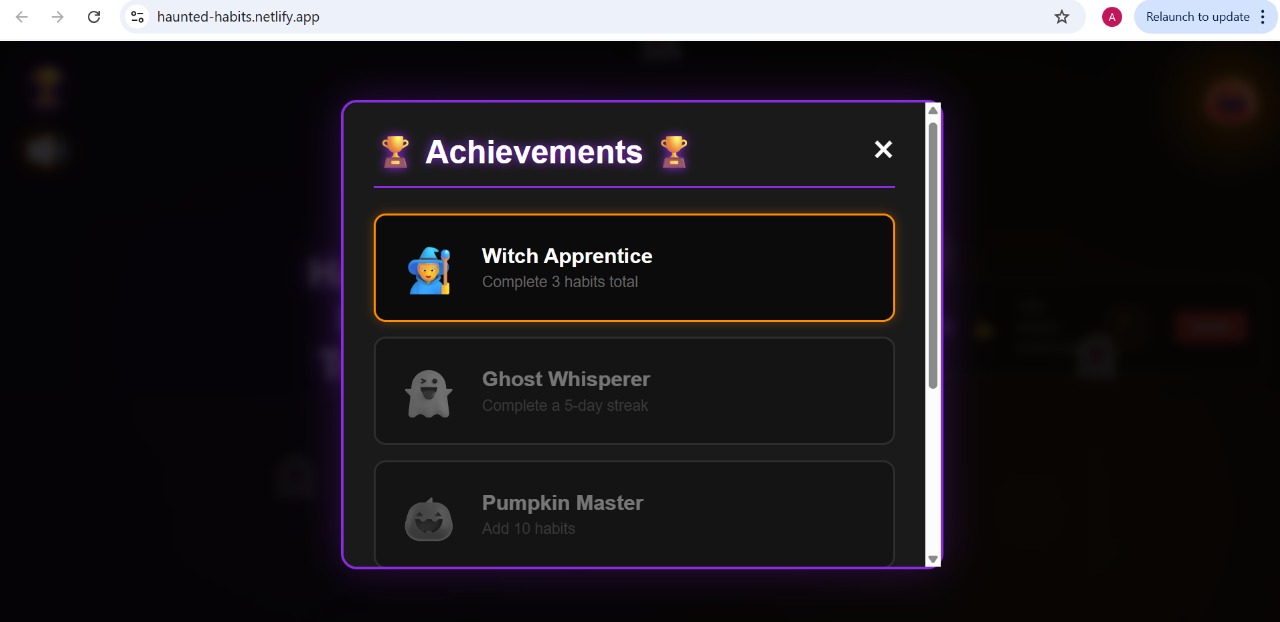 A spooky animated popup that appears when the user unlocks an achievement such as completing 3 habits.