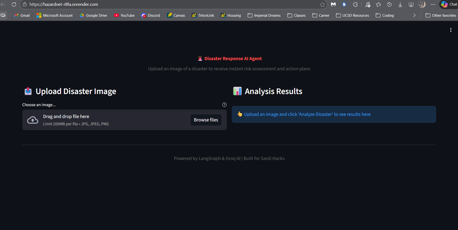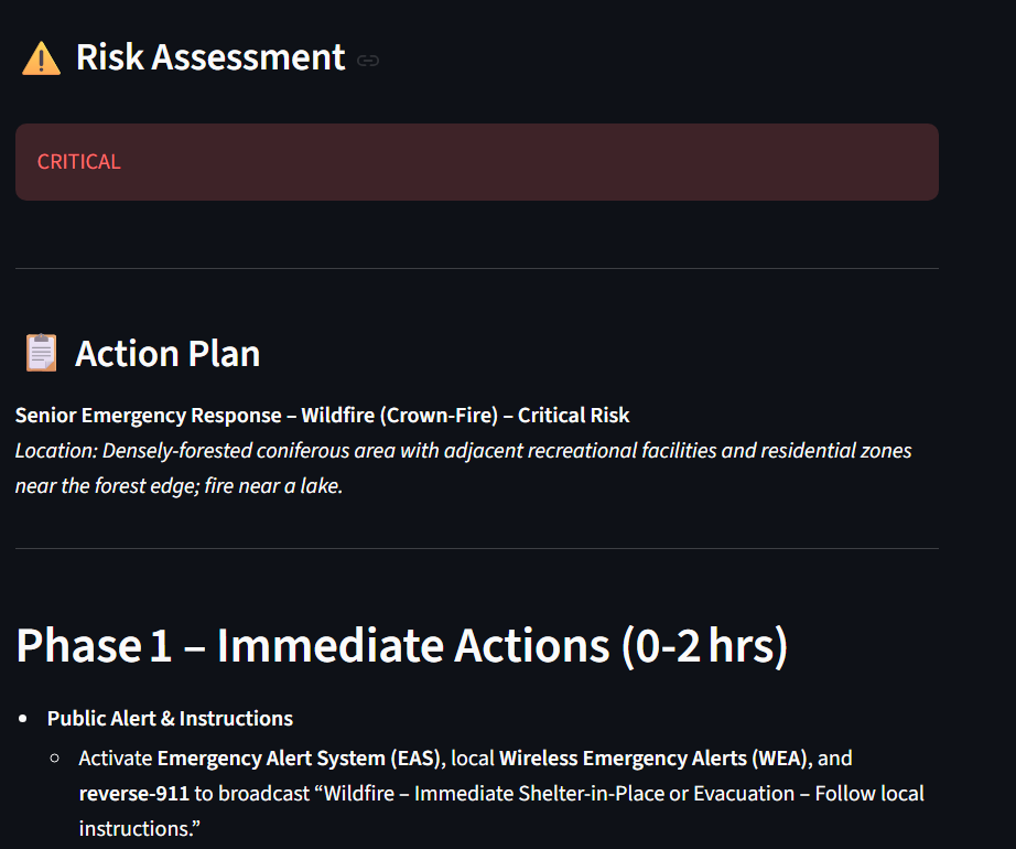 We built a multi-agent system that detects signs of wildfires and floods, assesses their severity, suggests realistic response actions and shares the findings with local authorities. The system is a LangGraph made of linked agents, implementing Groq AI and image-detection agents powered by the Llama 4 vision LLM.