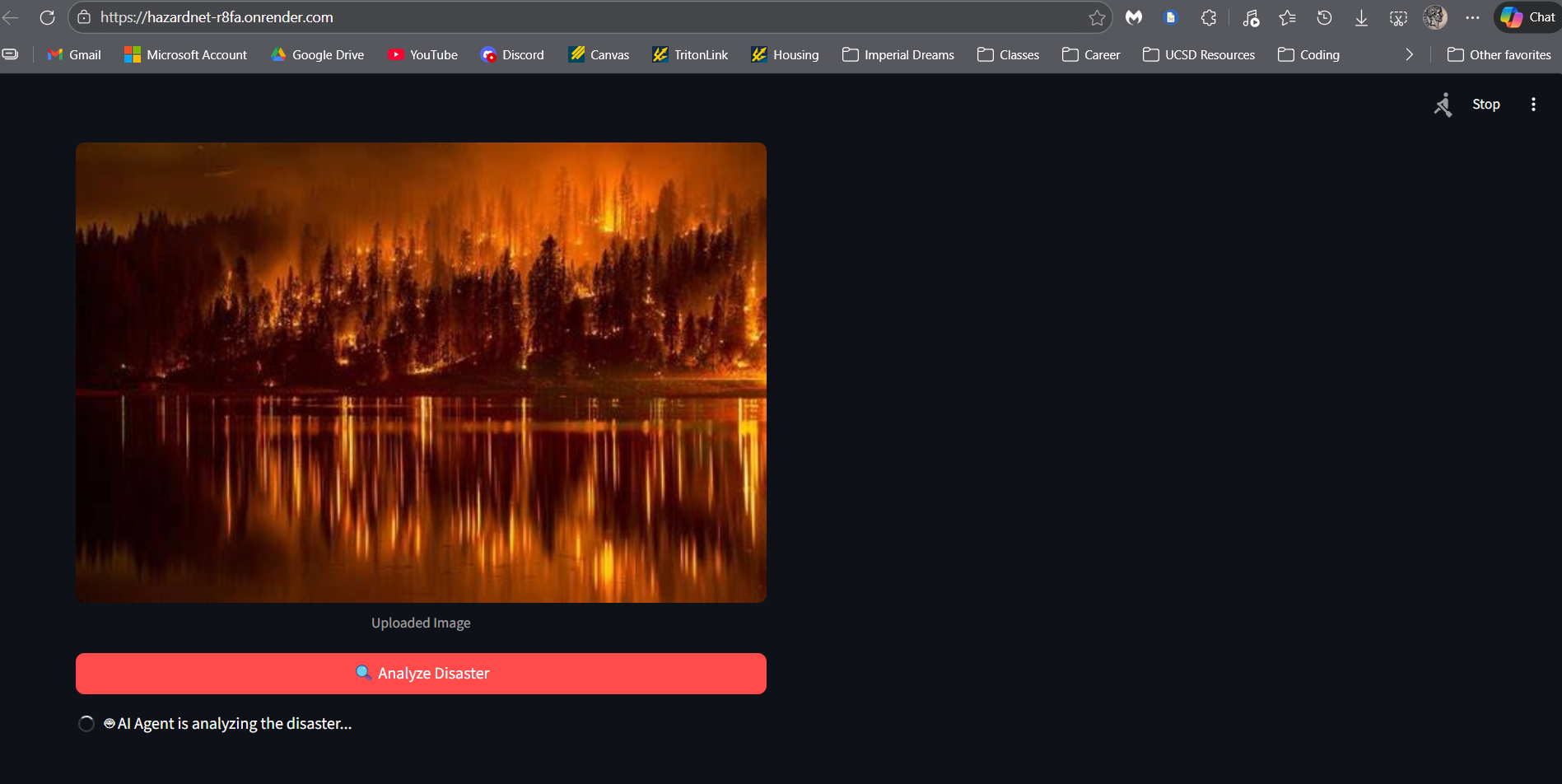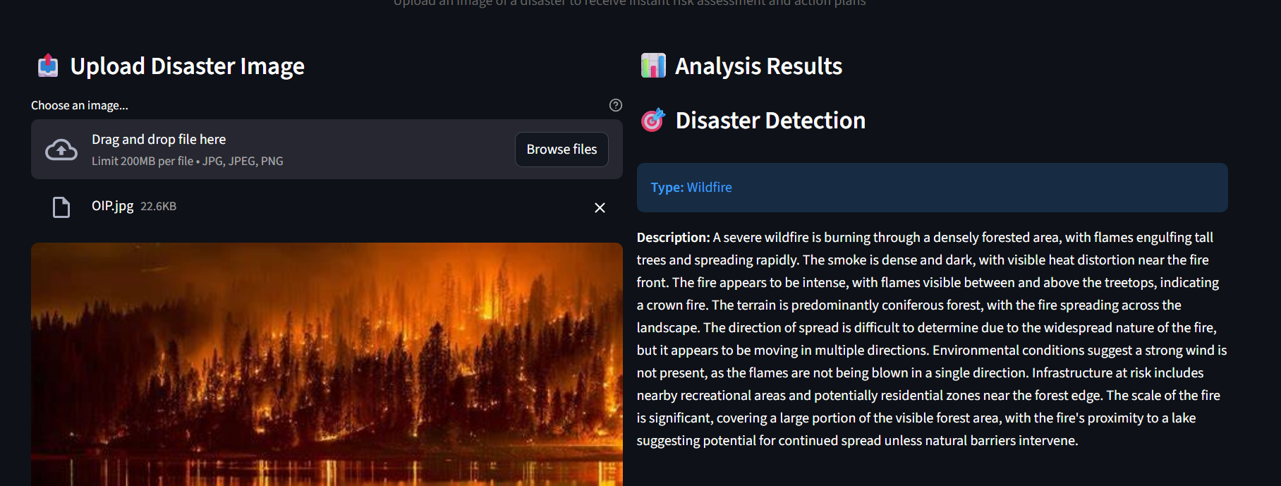 Detector Agent: This agent will detect signs of a wildfire or a flood using images of weather phenomena from valid sources like CCTV footage and drone footage etc. As soon as it sees conditions like reduced visibility or severe haze, unusual smoke in the air, a high waterline or other visible characteristics, the model will detect a weather hazard and classify it.