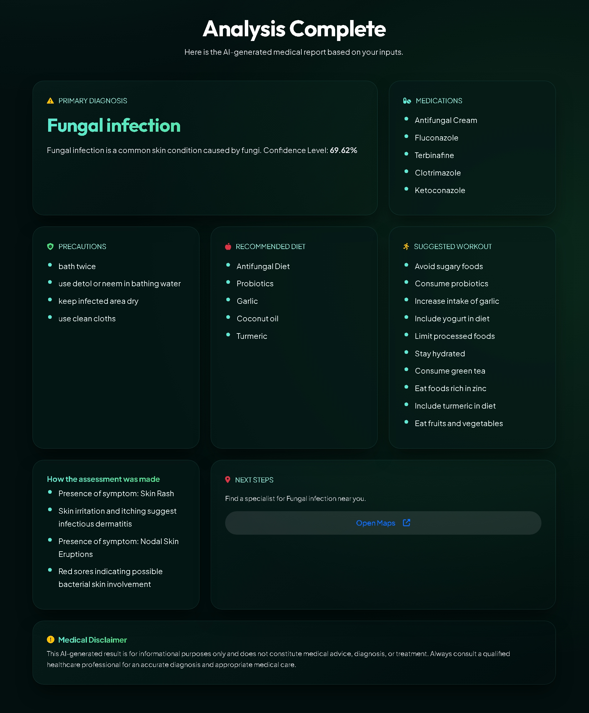 Symptom-based disease prediction with confidence scoring and a structured 360° recovery roadmap.