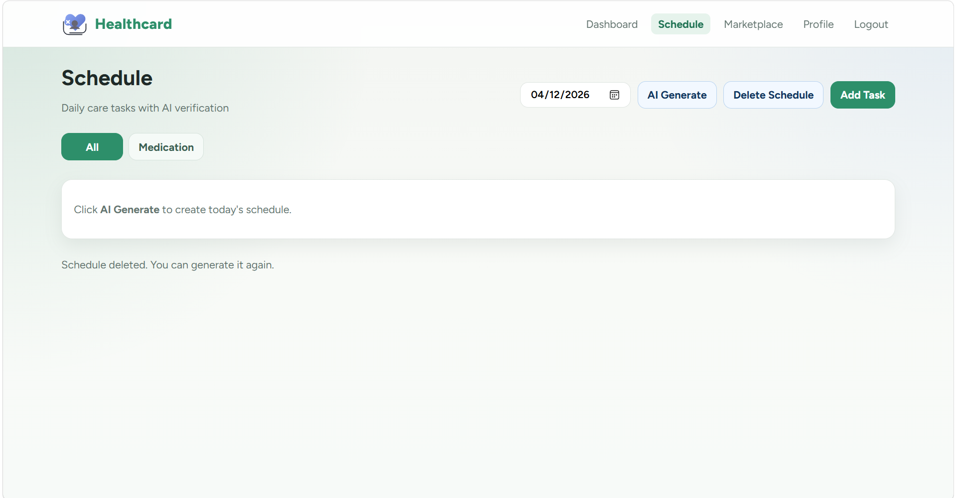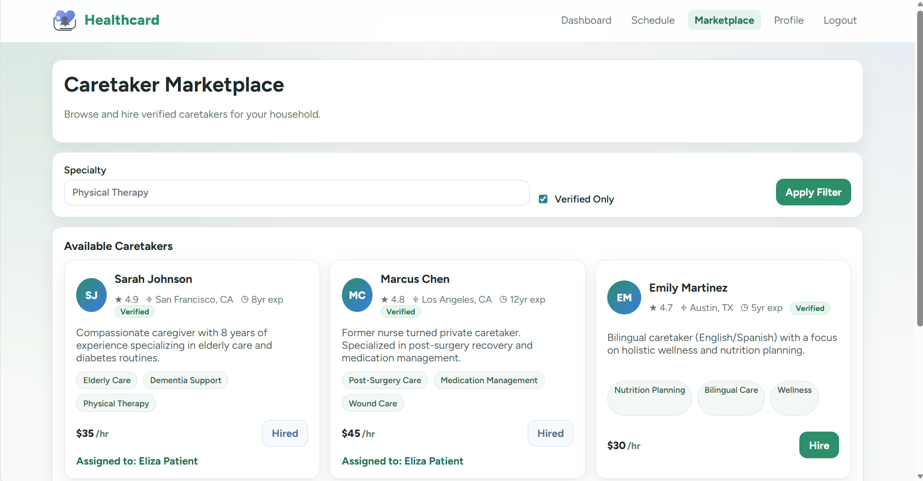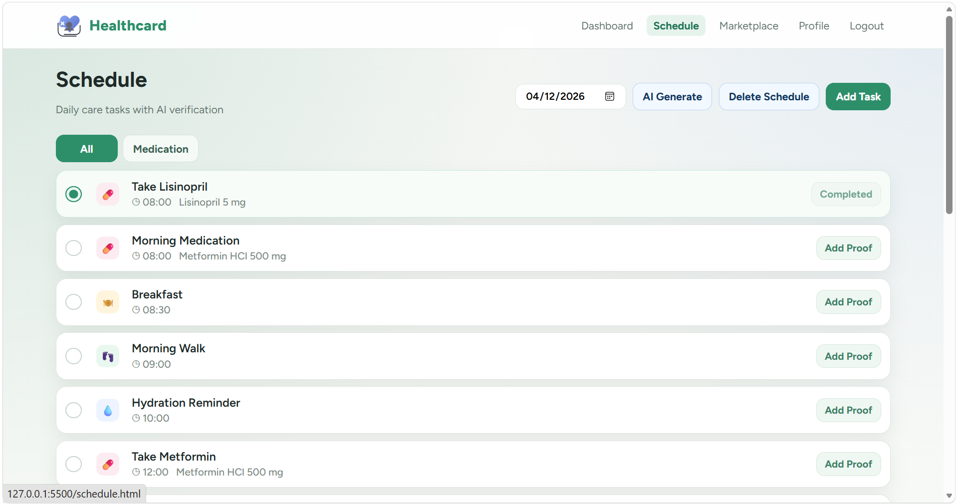 HealthCard is an end-to-end AI caregiving platform that monitors elderly patients at home across four dimensions simultaneously: -Medication tracking with computer vision. Point a phone camera at any pill bottle or tablet. Our QR/vision scanner identifies the medication, cross-references it against the patient's schedule, and logs it — no typing required. If a dose is missed, the system detects it and escalates.