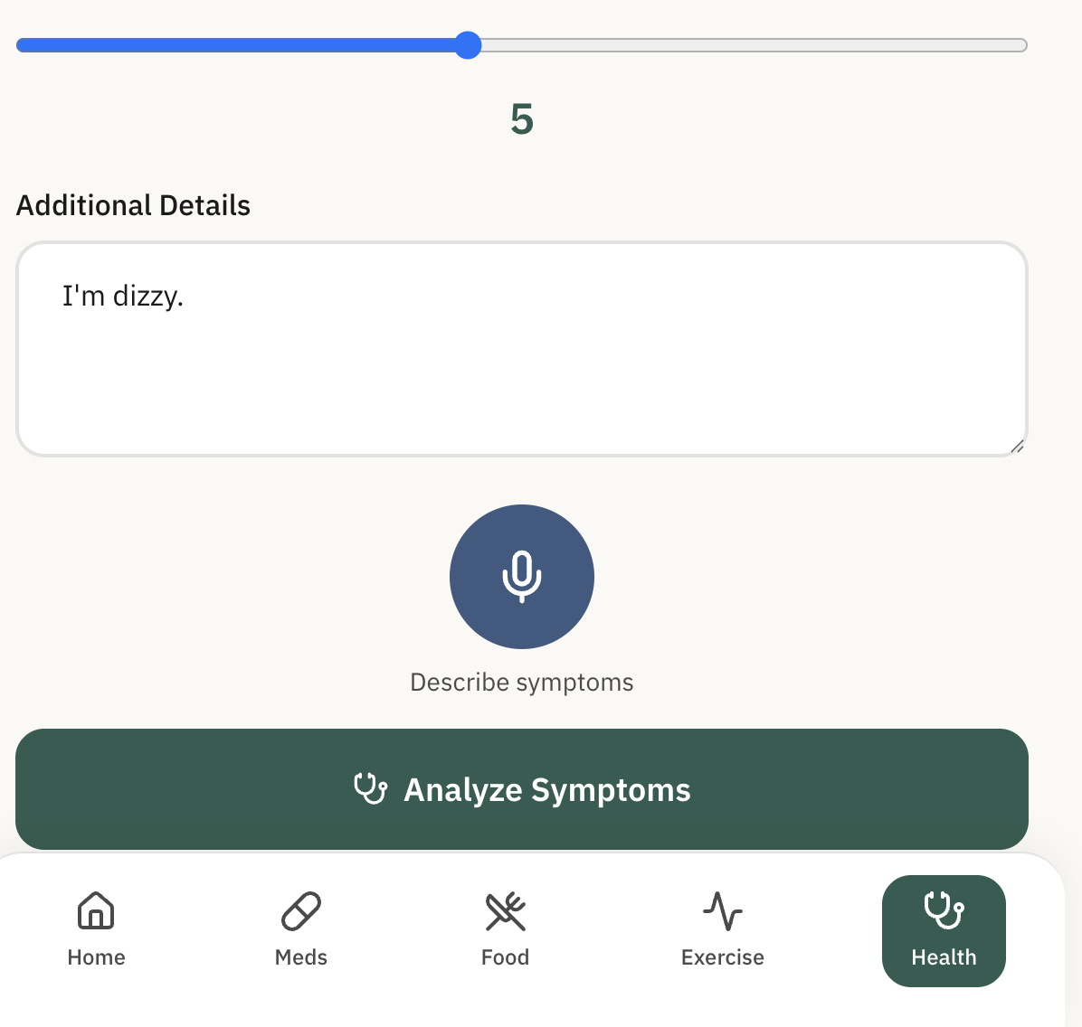 -Voice-first symptom logging. Because elderly users shouldn't have to type. Say "I feel dizzy and my chest is tight" and HealthCard transcribes, parses, and runs AI risk analysis on those symptoms against your known conditions and current medications in real time.