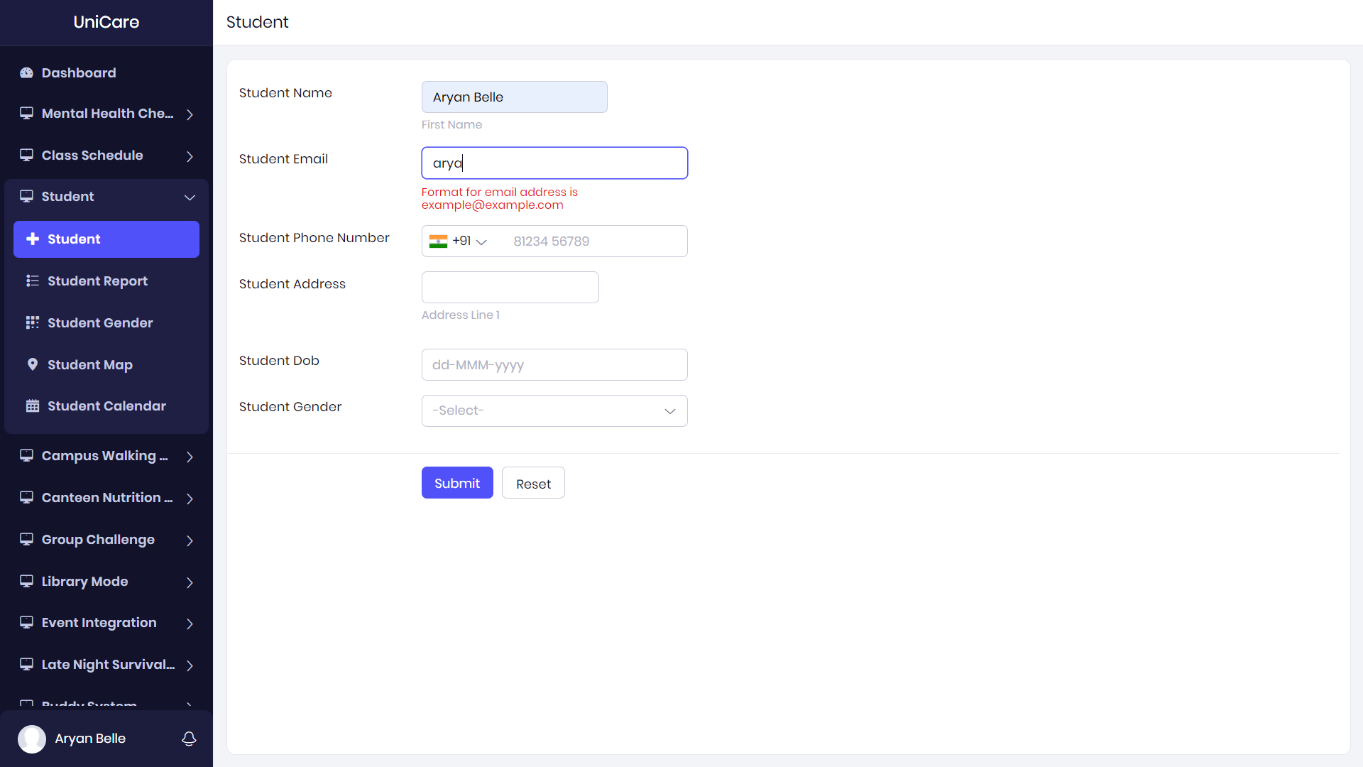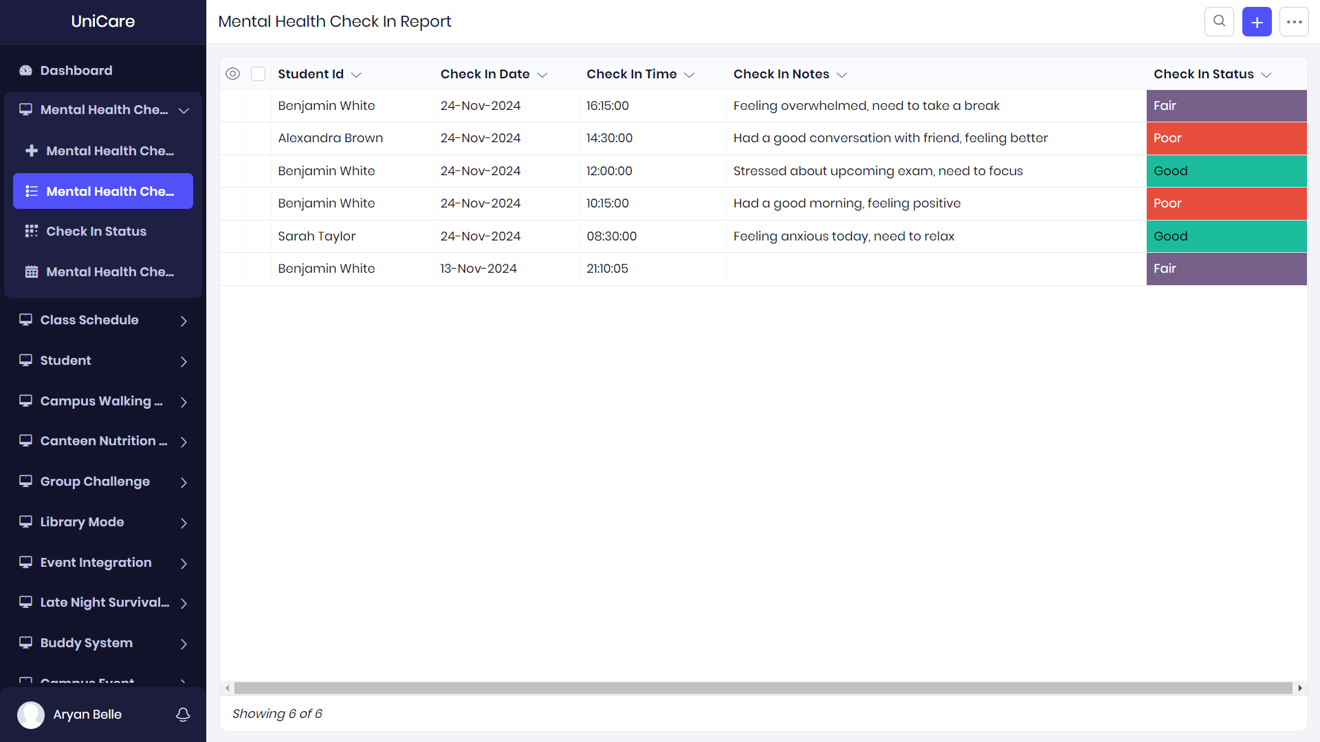 - Mental Health Check-ins: Students can log their mood and mental health status, with daily or weekly reports to track their emotional well-being.