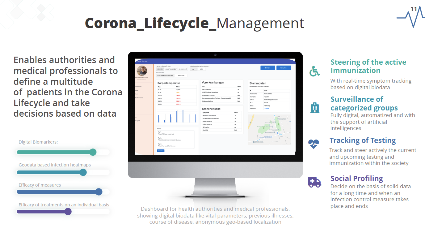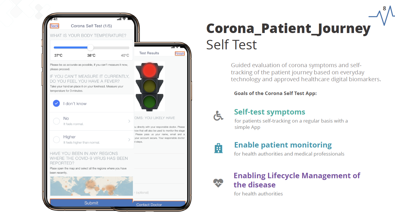 - Corona Patient Journey Tracking based on a self test: Enables patients to self-test their corona symptoms and track their own patient journey based on everyday technology and approved digital biomarkers,