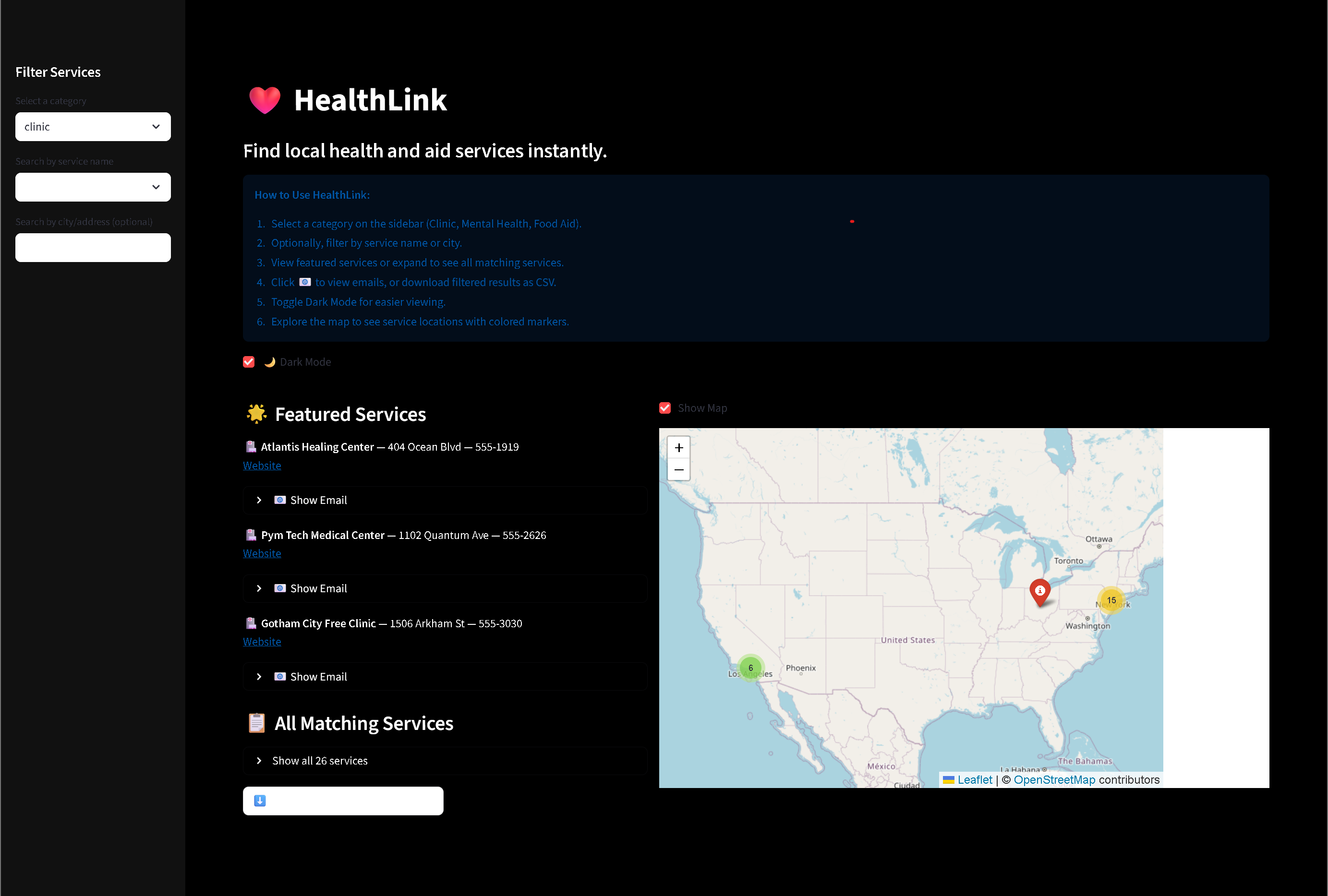 I built HealthLink using Python and Streamlit, with pandas to manage the data and Folium to create the interactive maps. Each service has its own marker on the map, color-coded by category, and clustering is used for busy areas. The app also has a dark mode for better accessibility. I also added CSV files to pull data from. For the CSV files i used random comic book locations to make it fun for viewers.
