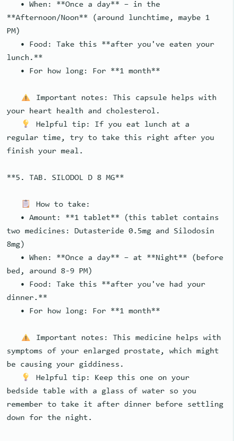 AI Prescription Scanner -Capture/upload prescriptions -Gemini Vision extracts medicines, dosage, frequency, food instructions, and diagnosis -Converts into structured, readable data -Translates to English, Hindi, and Kannada currently