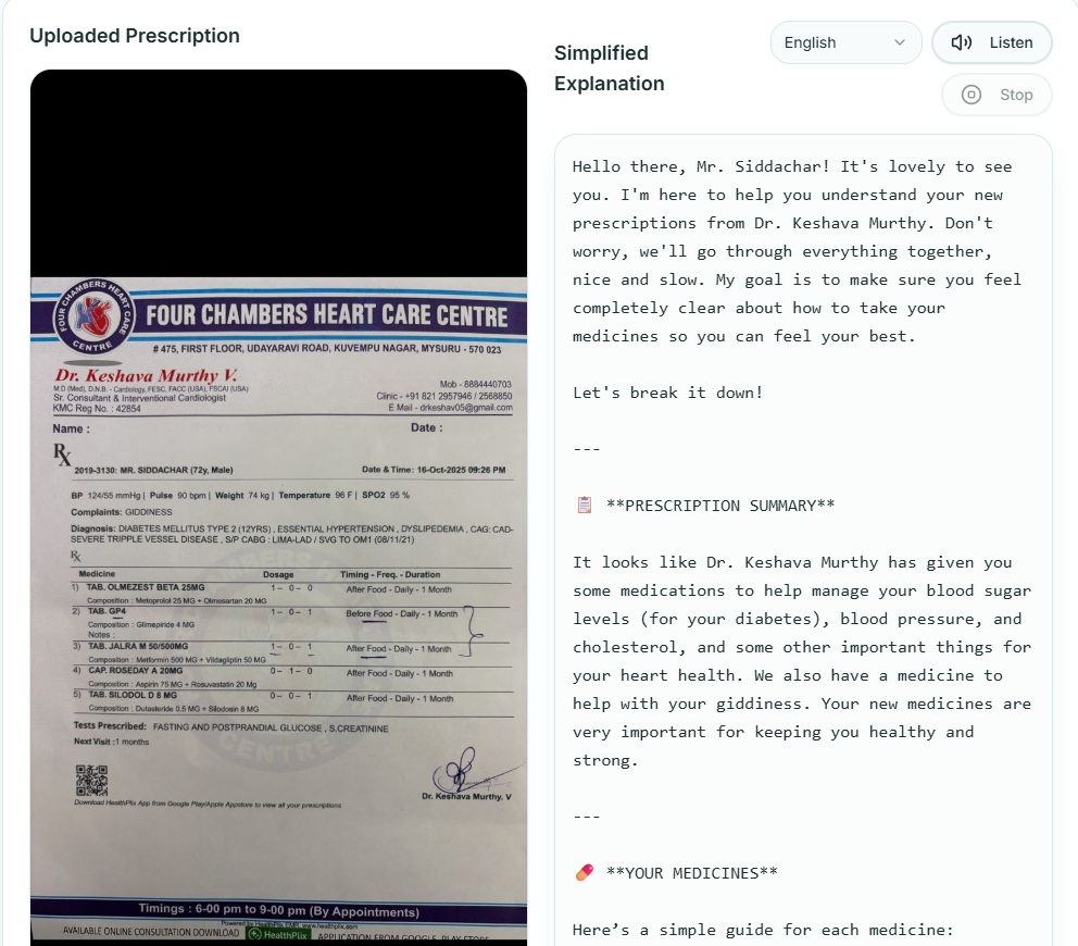 India’s healthcare system faces critical challenges in accessibility, continuity of care, and patient understanding. Patients often struggle to interpret handwritten prescriptions, follow dosage instructions, track vitals, and communicate symptoms clearly before consultations. Doctors lack structured pre-visit data, resulting in lost time and incomplete context. Families managing multiple dependents have no unified medical record system. There is no single multilingual platform that combines AI-driven prescription digitization, health monitoring, family health management, and doctor-facing clinical tools.