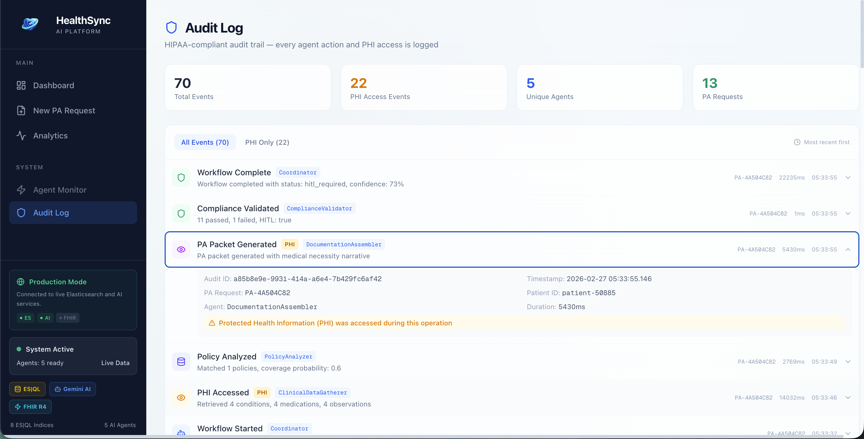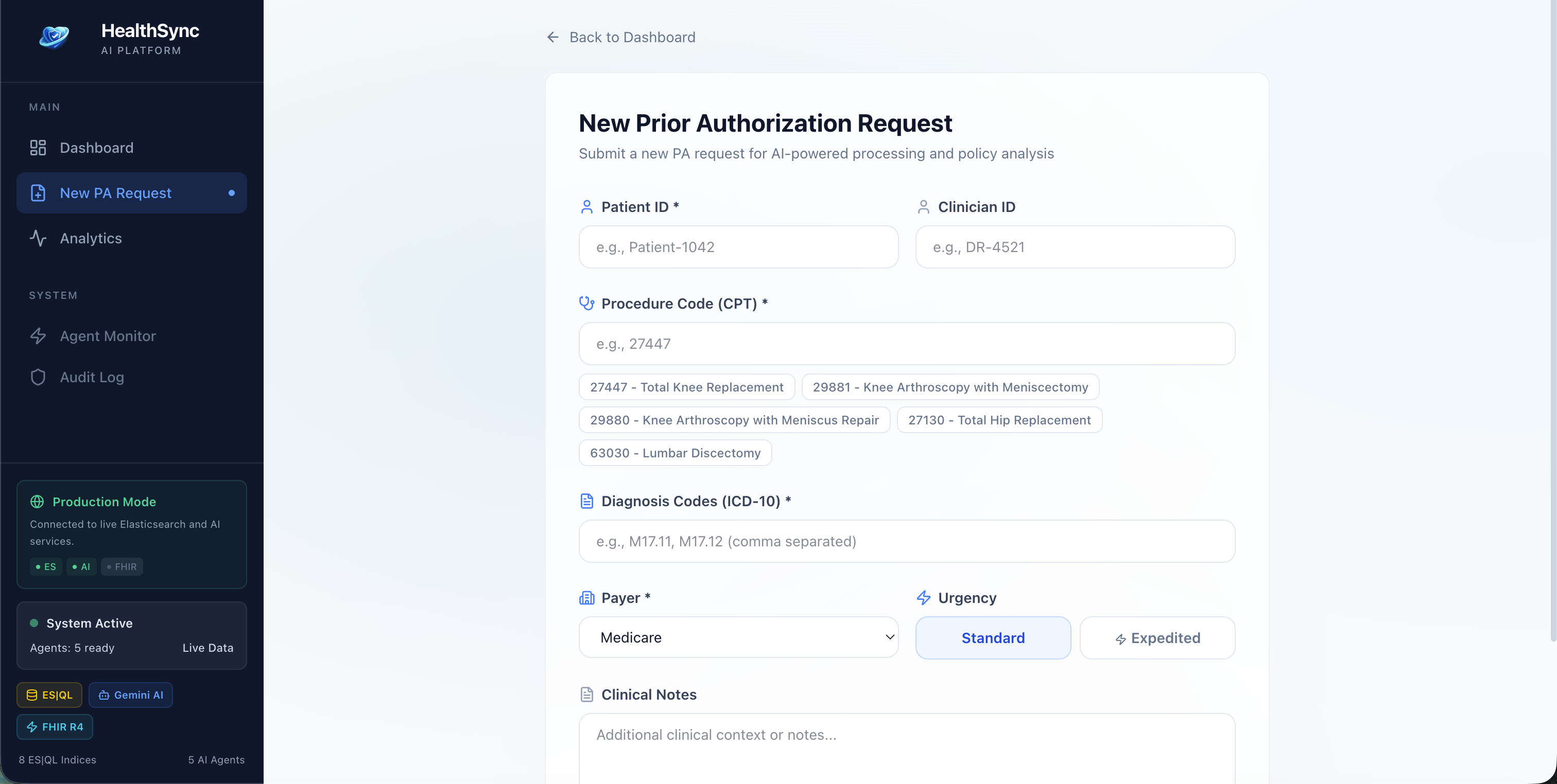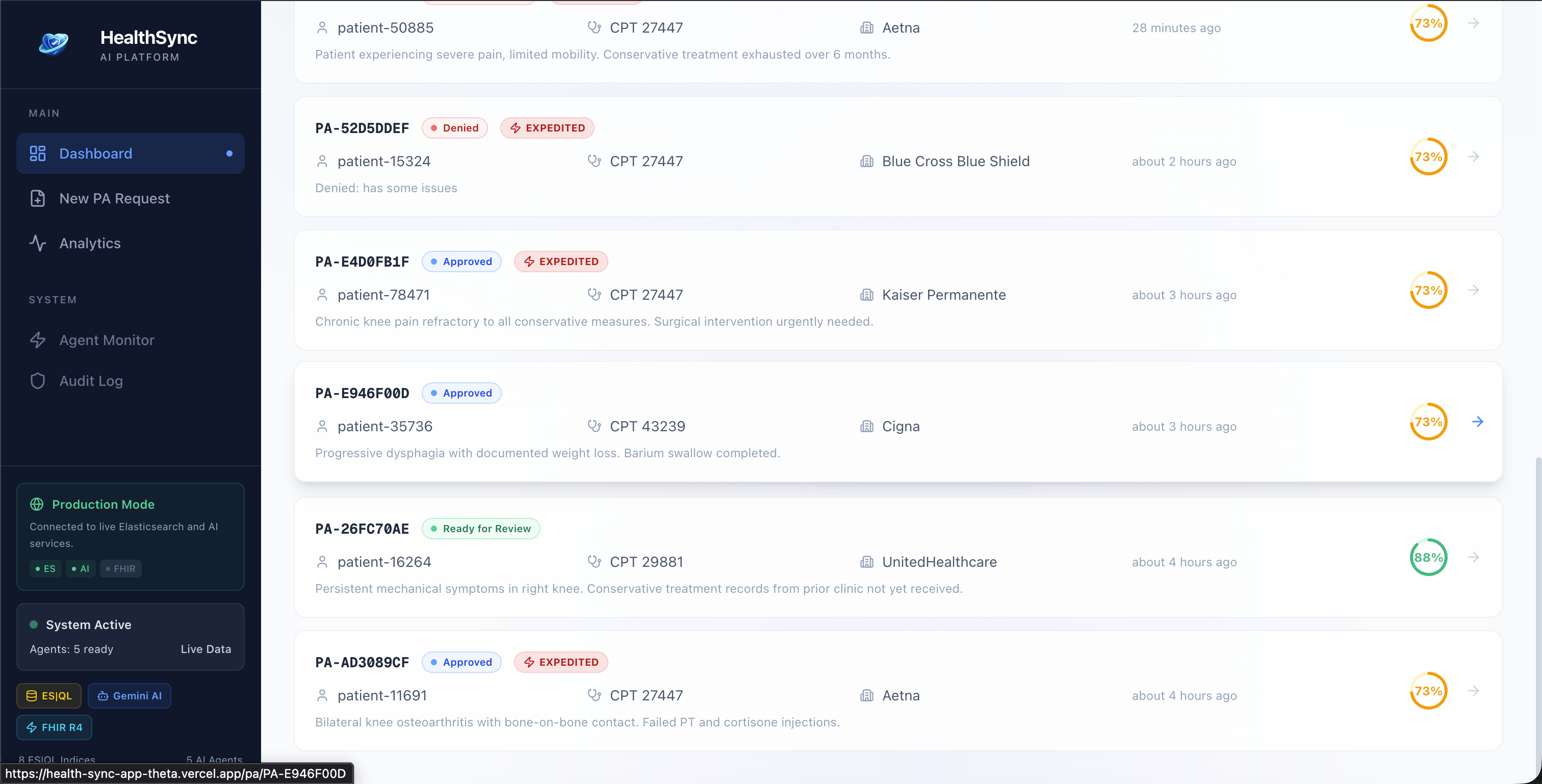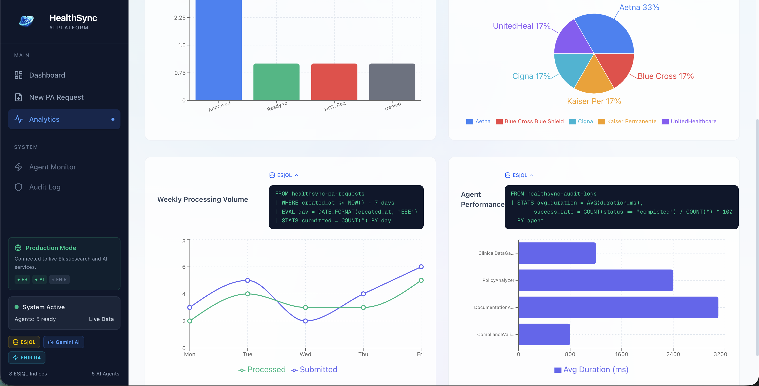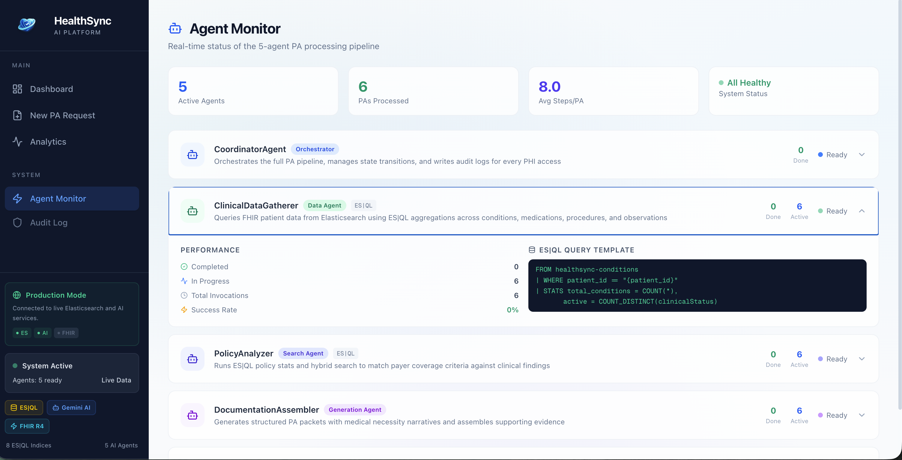 HealthSync App replaces the manual prior authorization workflow with a pipeline of 5 specialized AI agents orchestrated through Elasticsearch: