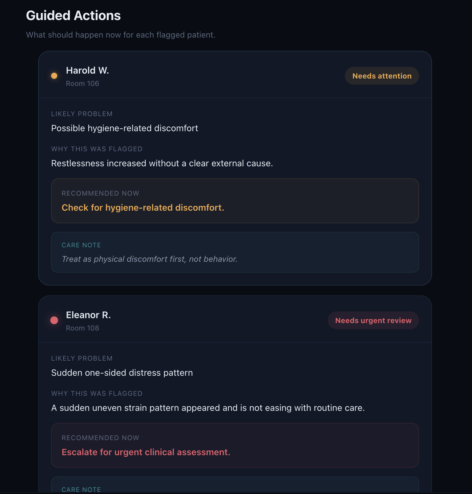 In long-term care, dementia care, and post-stroke recovery, caregivers often have to rely on visible distress or spoken complaints. But hidden discomfort does not always show up that way. We wanted to imagine a tool that helps caregivers notice those quieter signals earlier.