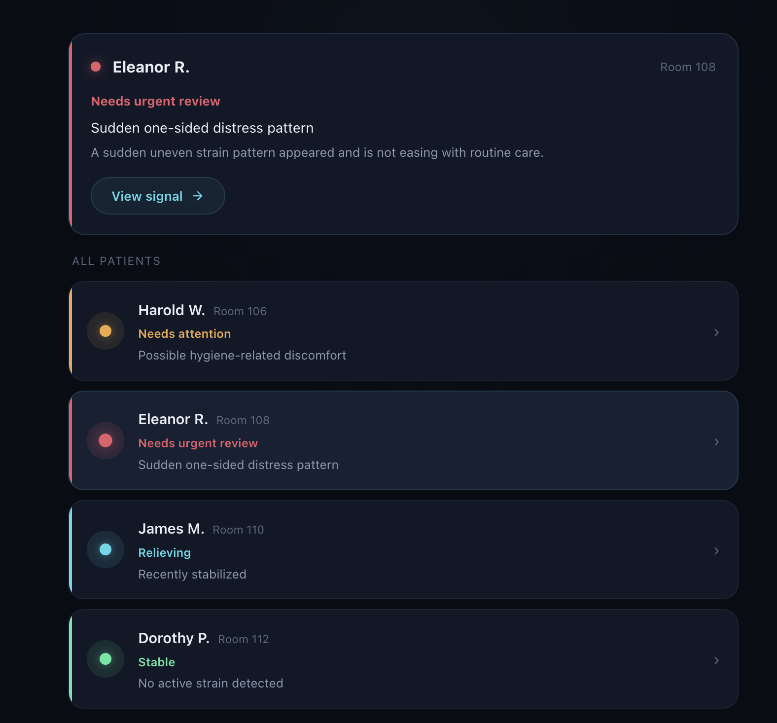 We started with a simple problem: some patients are in real physical discomfort before it becomes obvious, and before they can clearly say what’s wrong.
