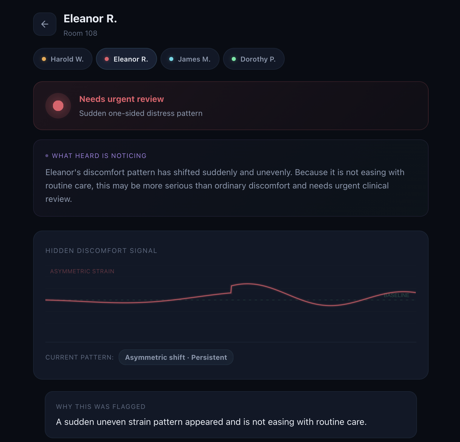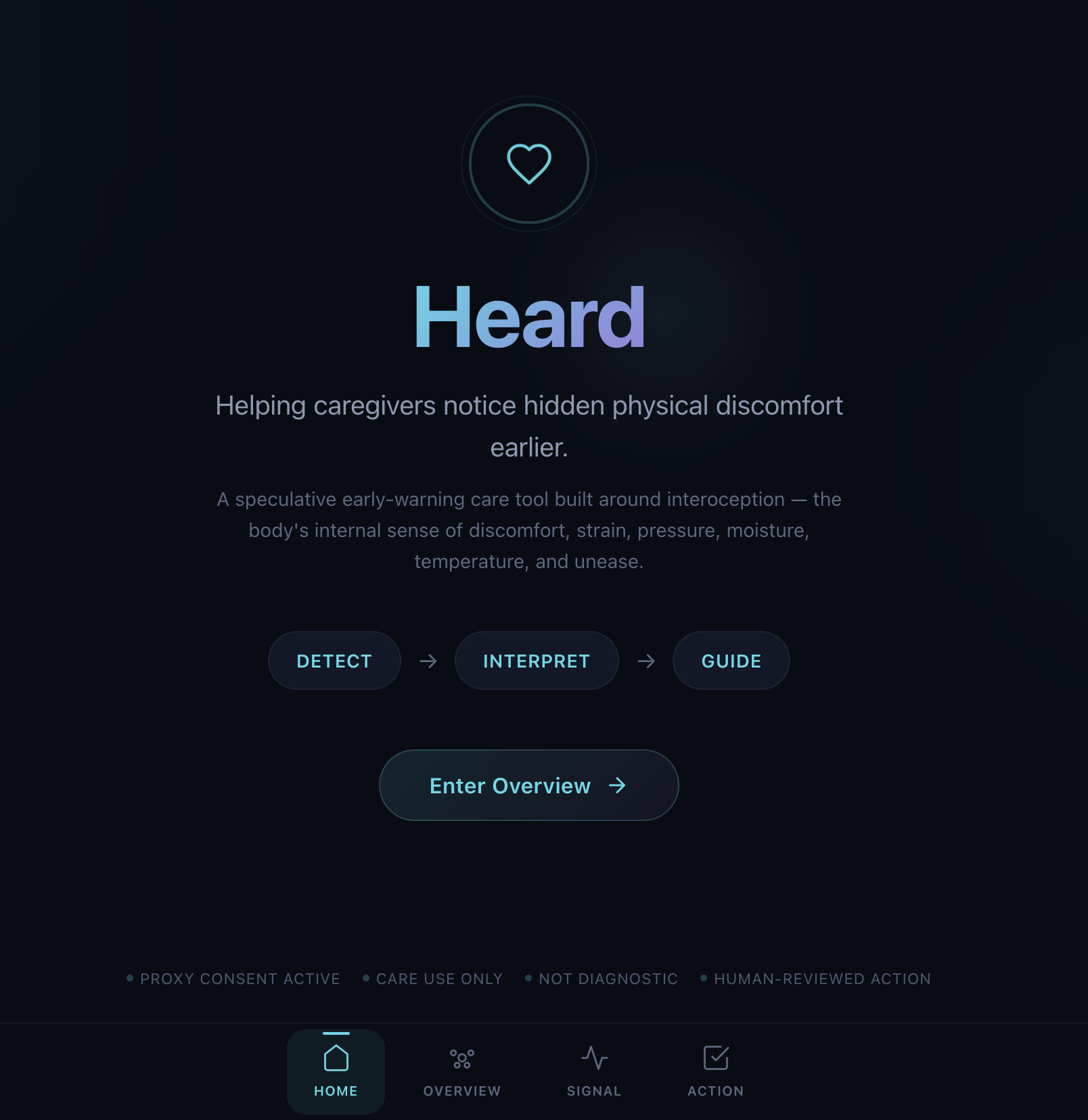 Heard is a speculative early-warning interoception tool for nurses and doctors. It helps caregivers notice hidden physical discomfort earlier, even when patients cannot clearly say what is wrong.