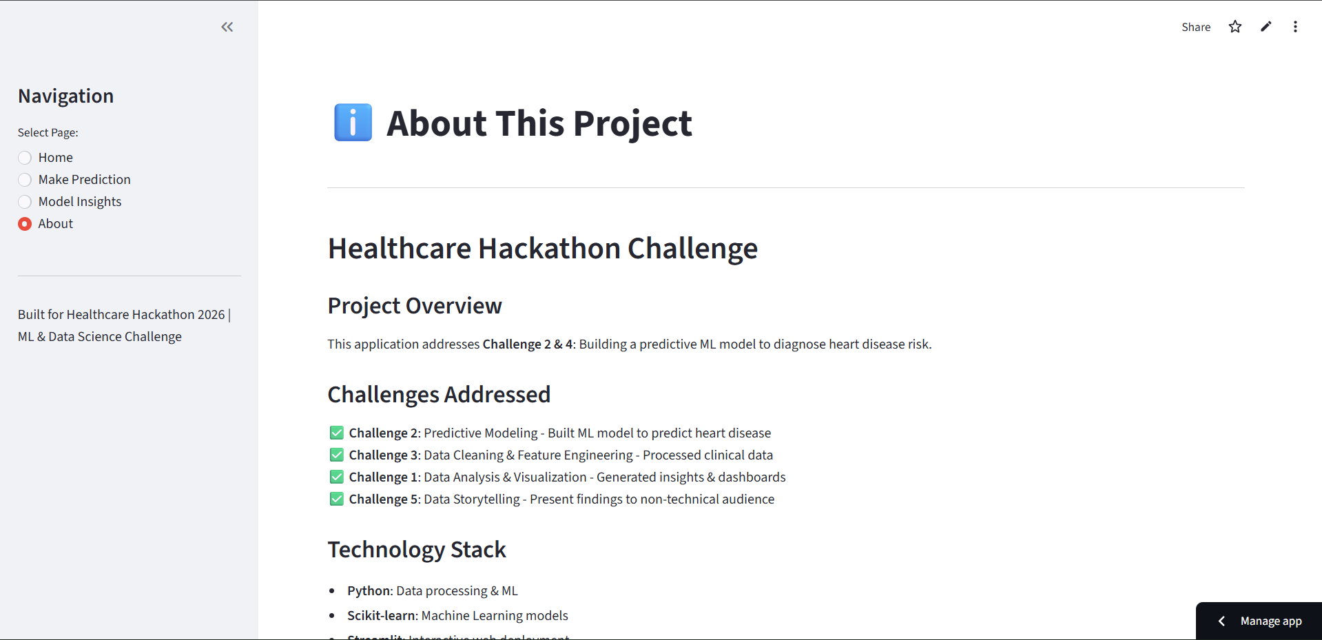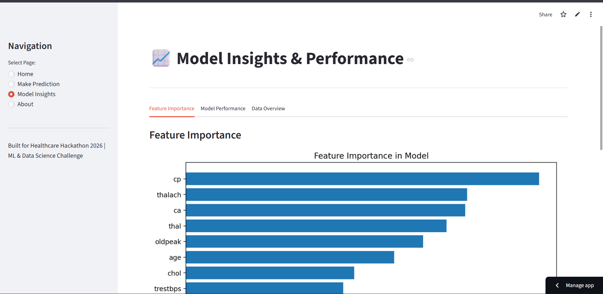 The Heart Disease Risk Prediction System is an AI-powered web application that analyzes clinical patient data and provides real-time predictions of heart disease risk. Users input medical parameters like age, blood pressure, cholesterol levels, and chest pain characteristics. The system instantly processes this data using a trained machine learning model and returns a risk assessment with supporting visualizations showing feature importance and model confidence metrics. The interactive dashboard also allows exploration of population-level patterns in the training data.
