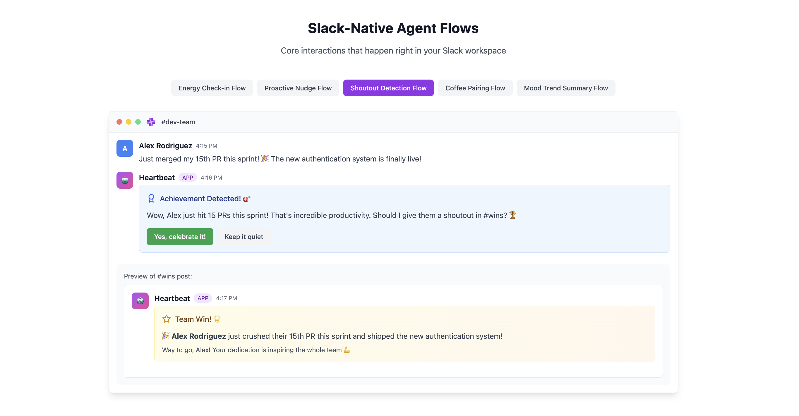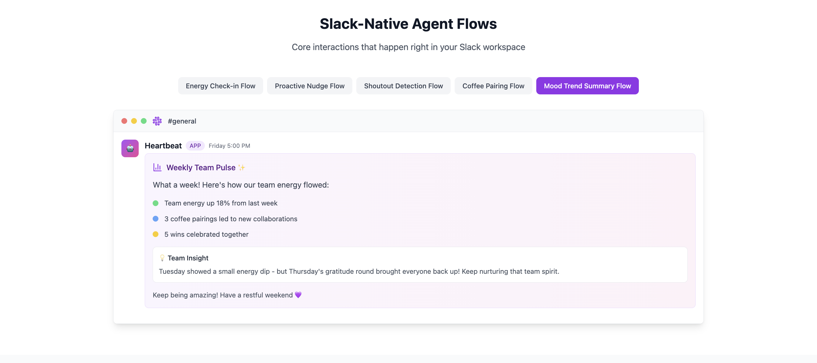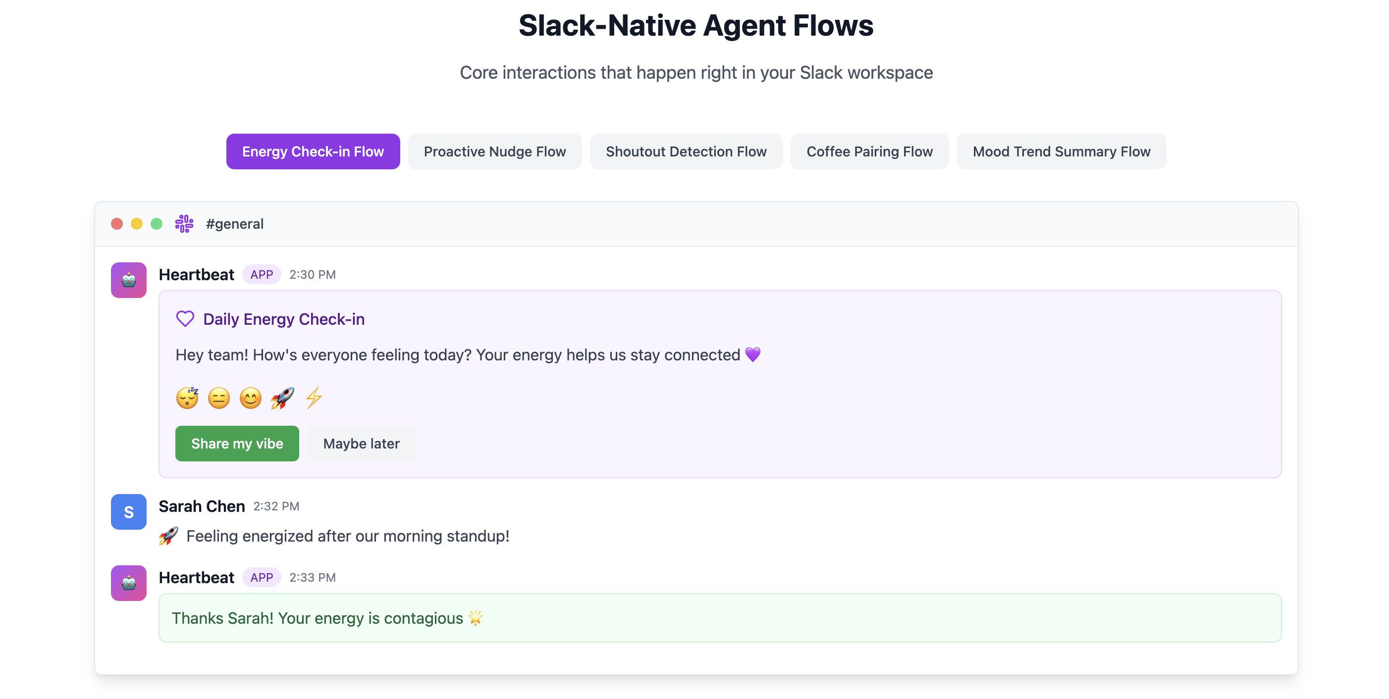 Heartbeat is a Slack-native, emotionally aware AI teammate for distributed teams. It helps your team stay connected, energized, and human — without extra meetings or micromanagement.