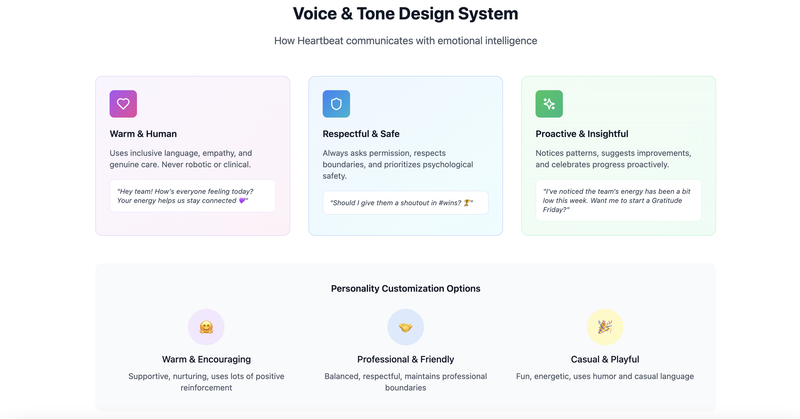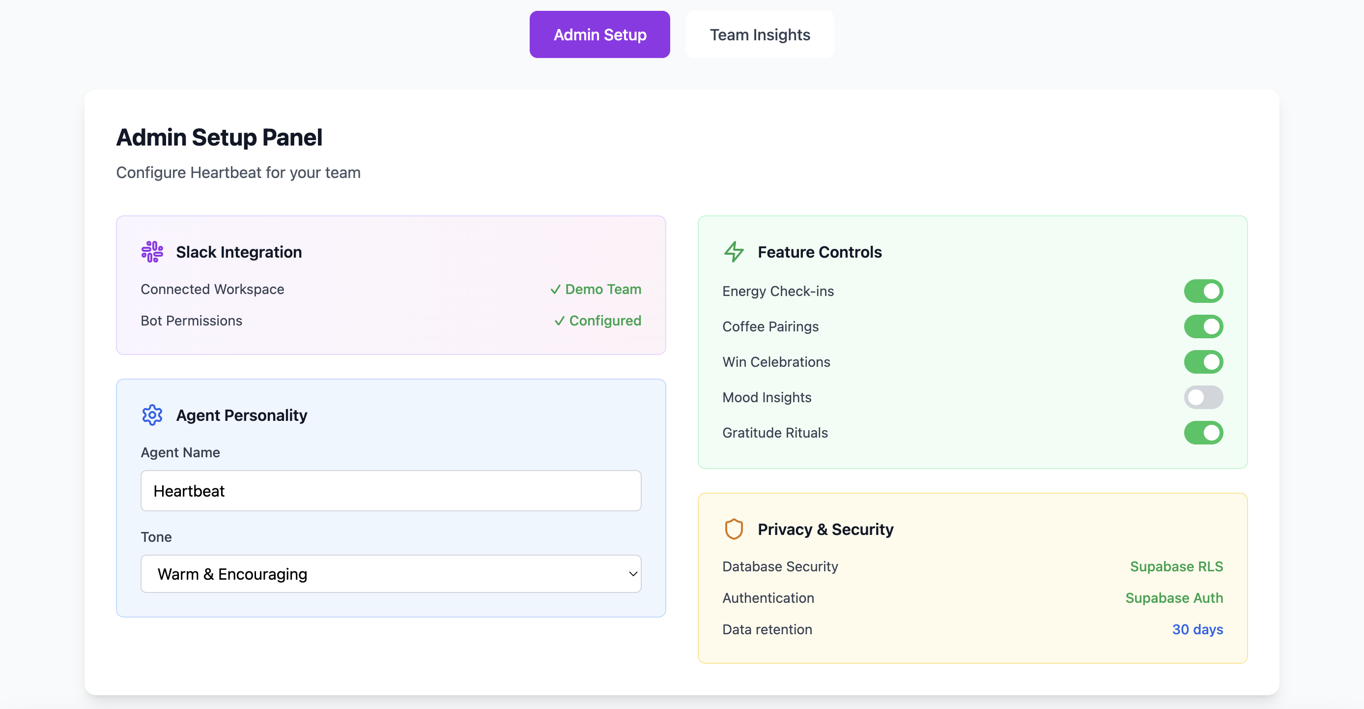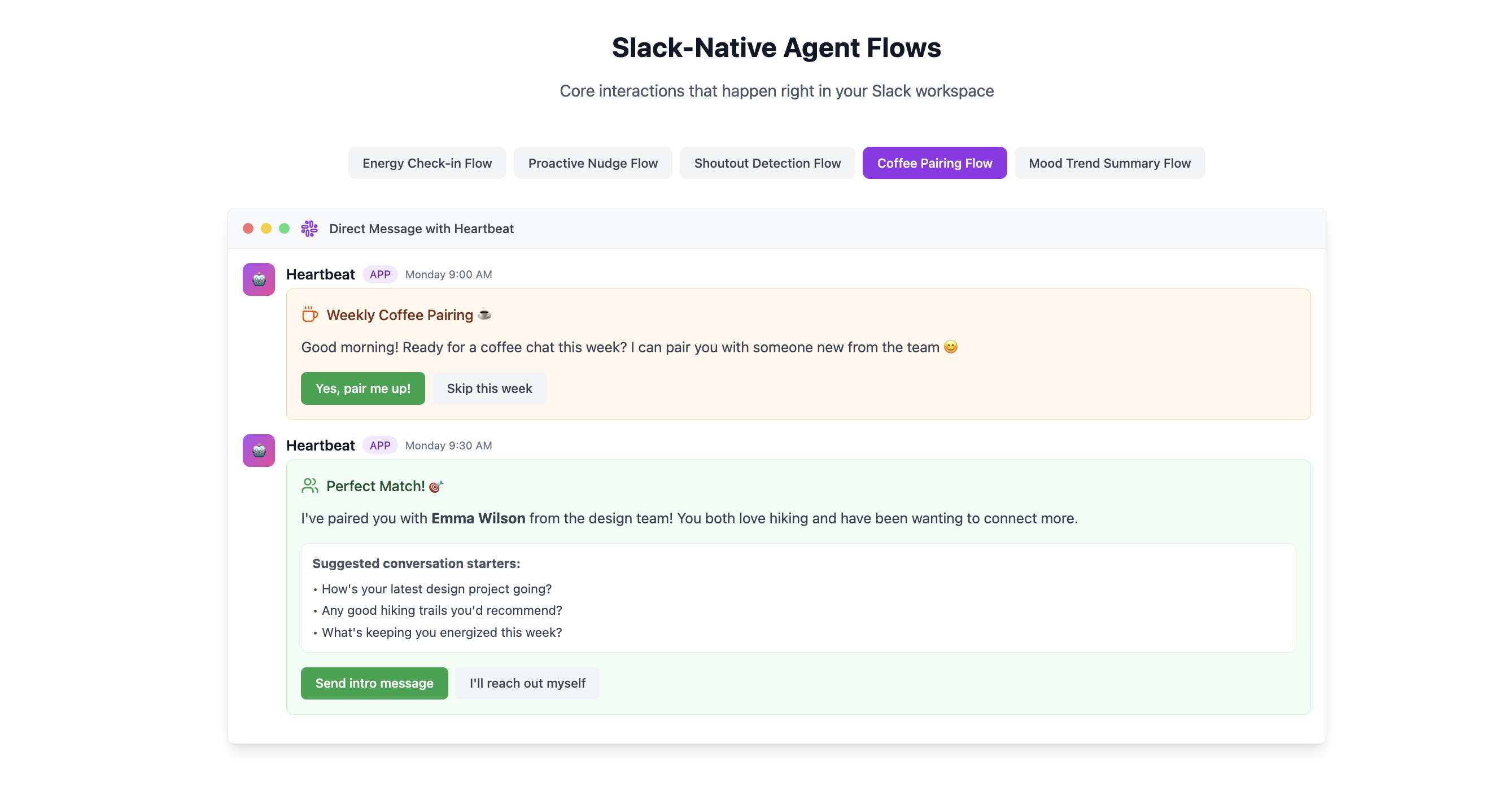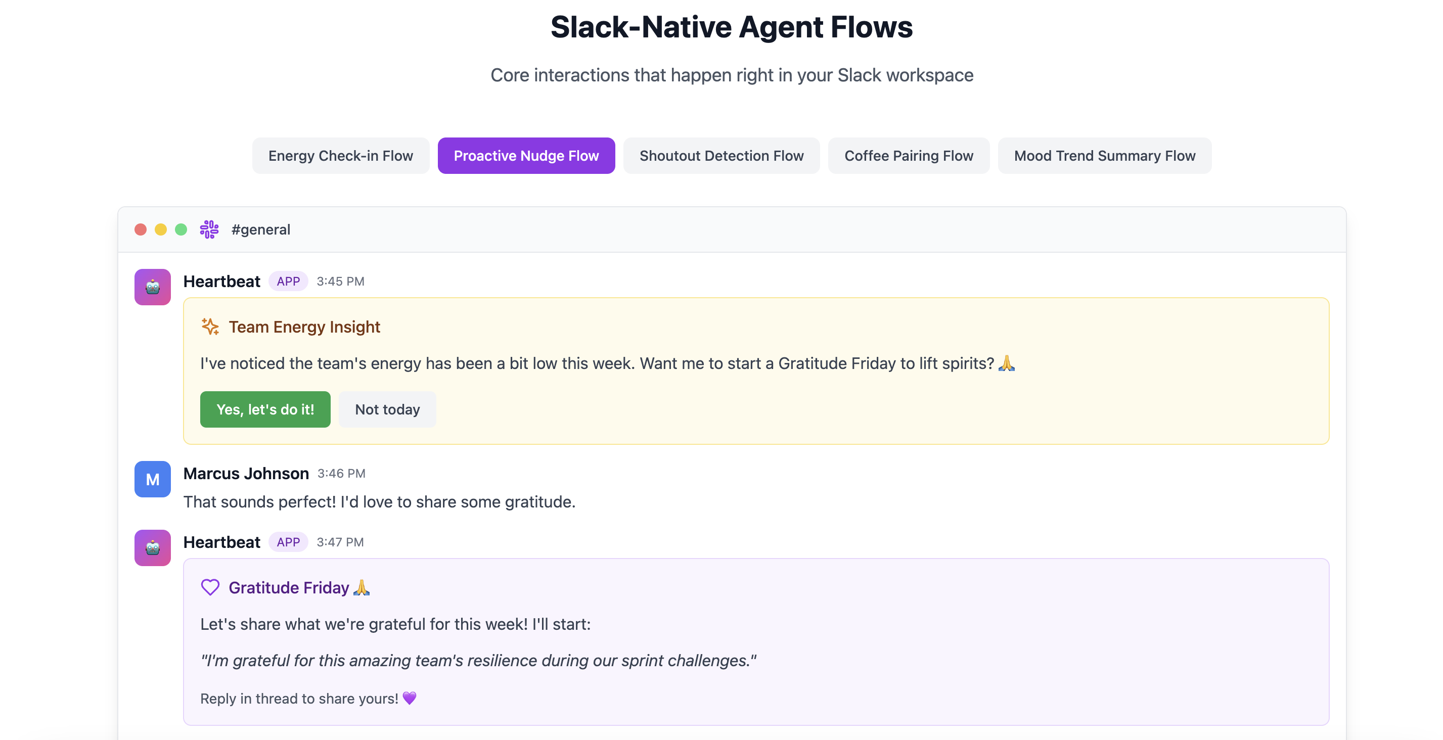 Heartbeat is a Slack-native, emotionally aware AI teammate for distributed teams. It helps your team stay connected, energized, and human — without extra meetings or micromanagement.