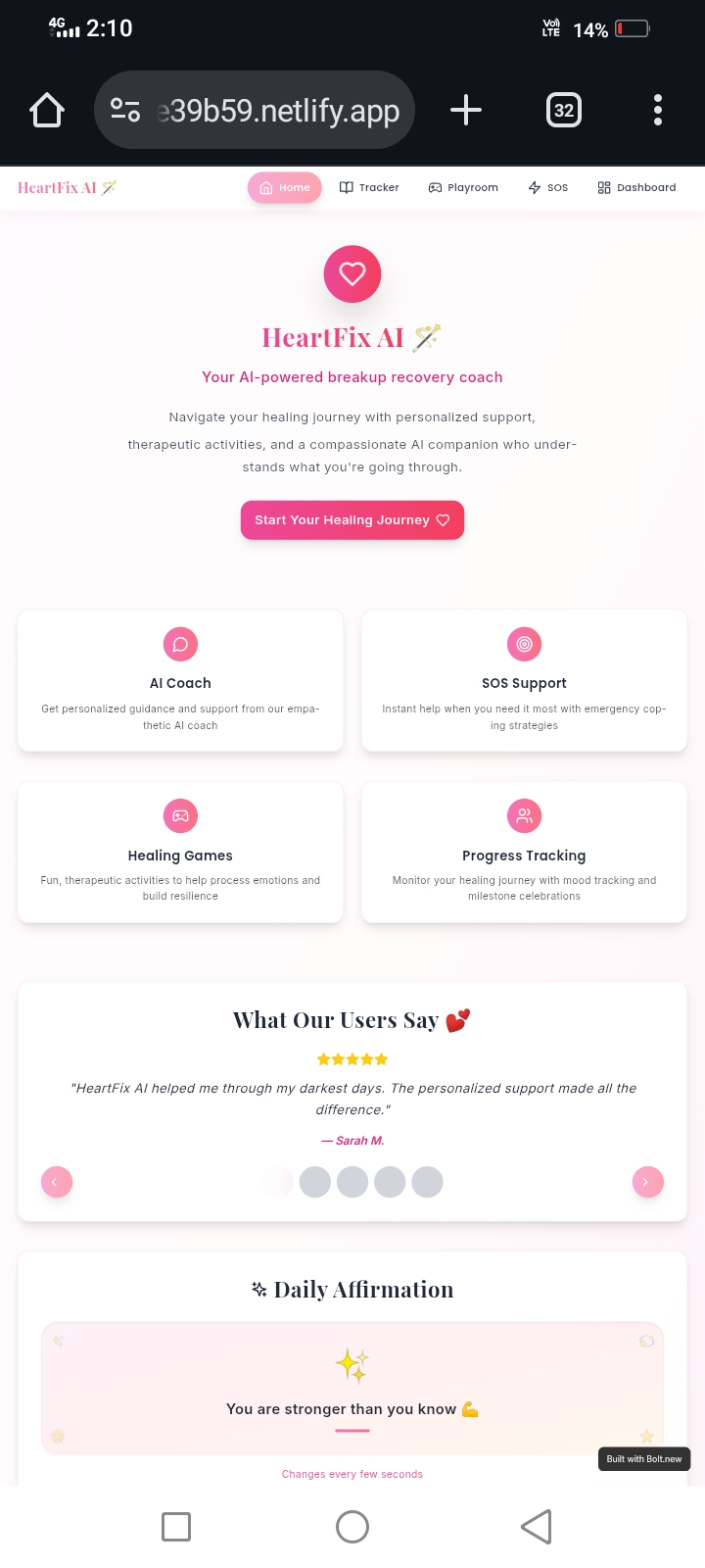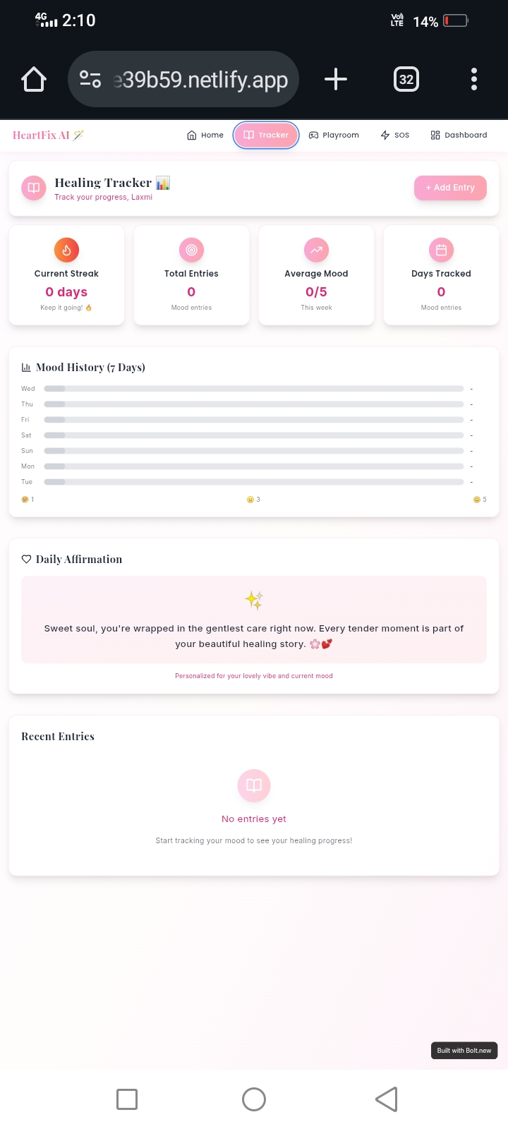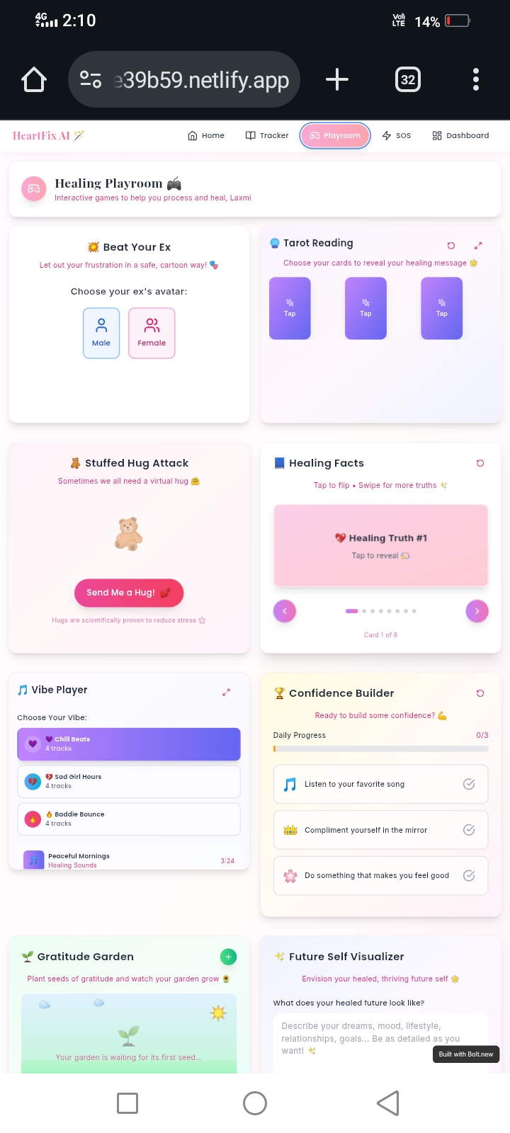 Breakups can feel like the end of the world โ we all deserve a safe, fun, and comforting space to heal emotionally. We noticed a lack of emotionally intelligent, interactive healing platforms that blend creativity, play, and real emotional support. Thatโs what inspired us to create HeartFix AI ๐ โ your personal AI-powered breakup recovery buddy.