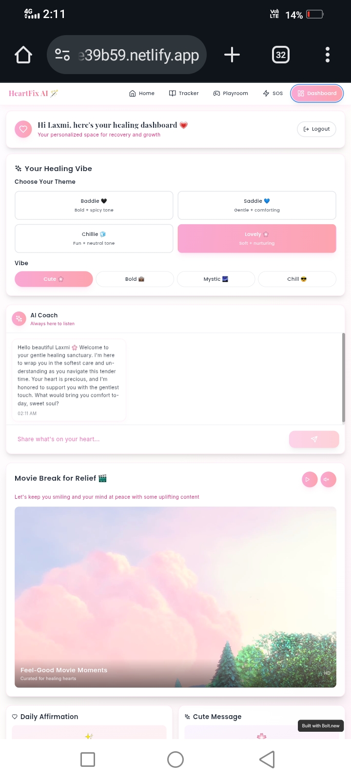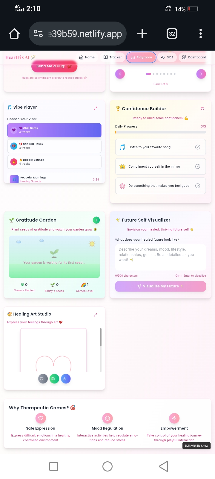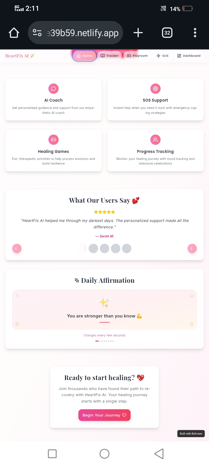 Breakups can feel like the end of the world โ we all deserve a safe, fun, and comforting space to heal emotionally. We noticed a lack of emotionally intelligent, interactive healing platforms that blend creativity, play, and real emotional support. Thatโs what inspired us to create HeartFix AI ๐ โ your personal AI-powered breakup recovery buddy.