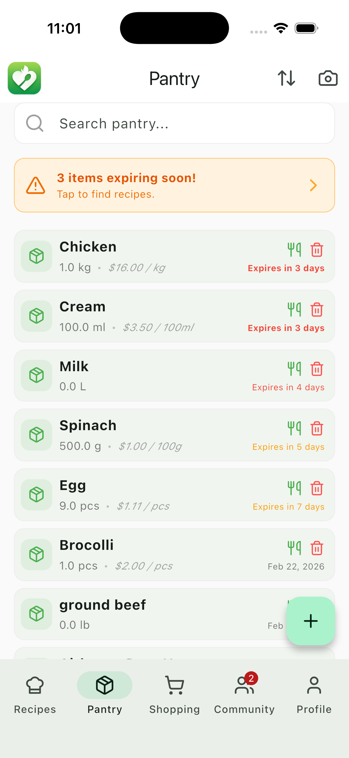 Users can import recipes from links or videos and instantly generate grocery lists. The app tracks pantry and refrigerator inventory, adjusts shopping lists based on what’s already available, and recommends recipes that reduce food waste.