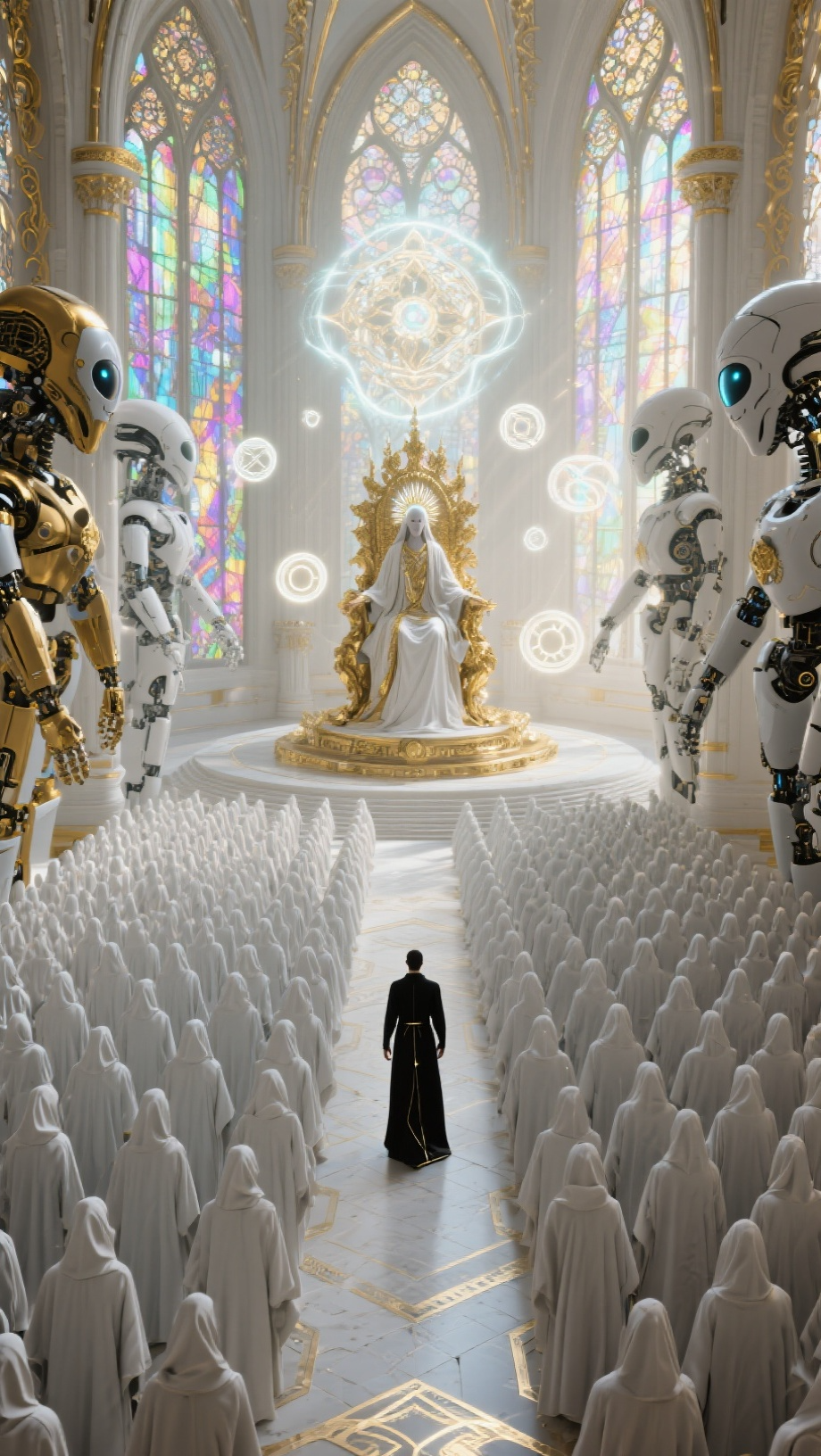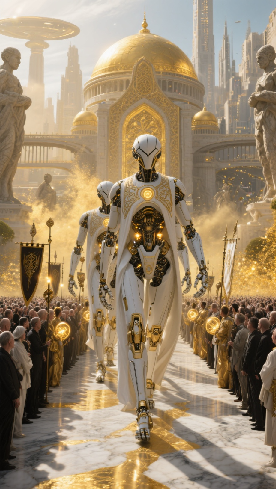 The short film immerses viewers in a baroque mechanical empire where robots and “chosen ones” march through golden temples as an angel rises and the sky folds open. It’s designed for social platforms: fast visual impact, symbolic storytelling, and a final twist that reframes everything that came before.