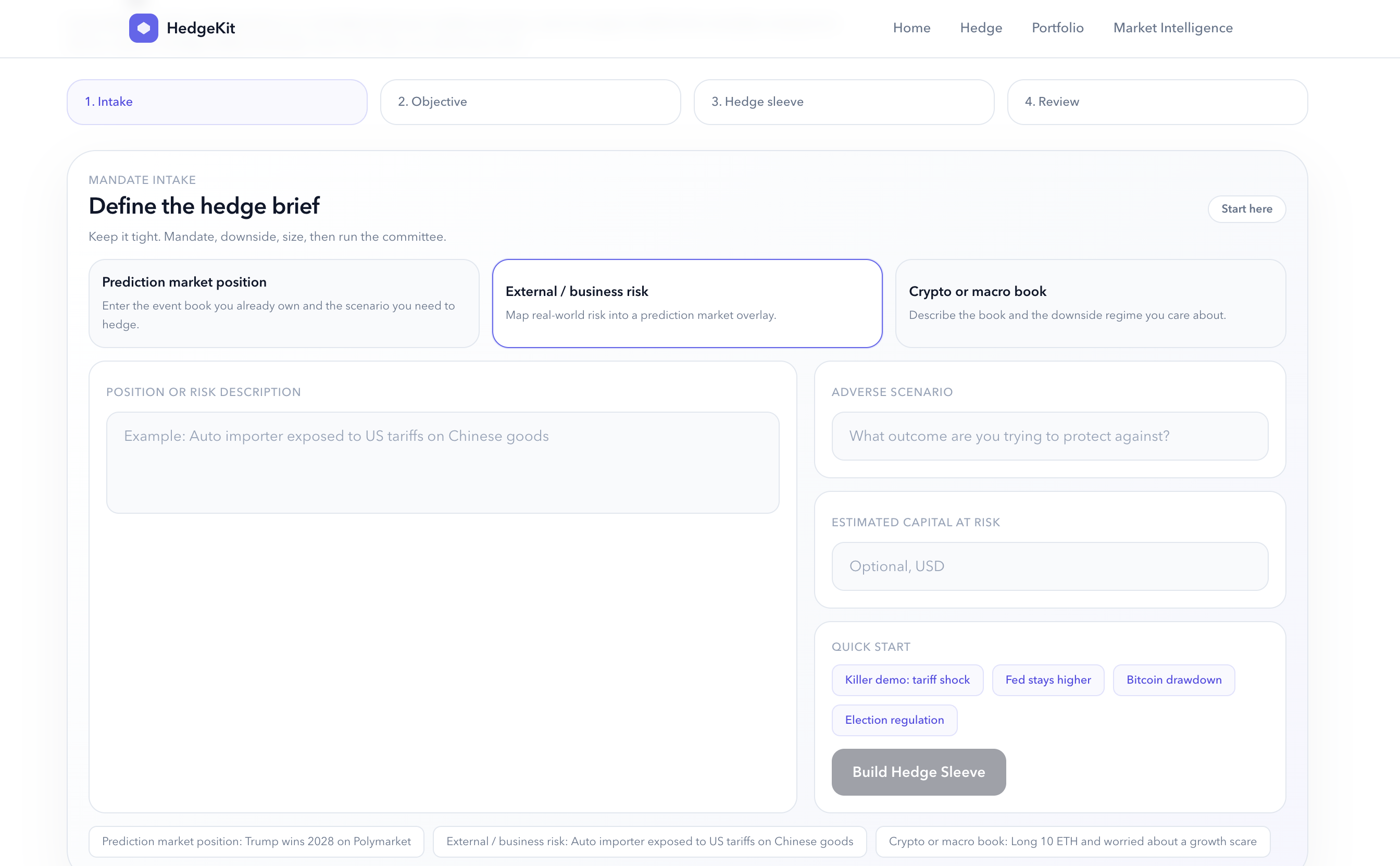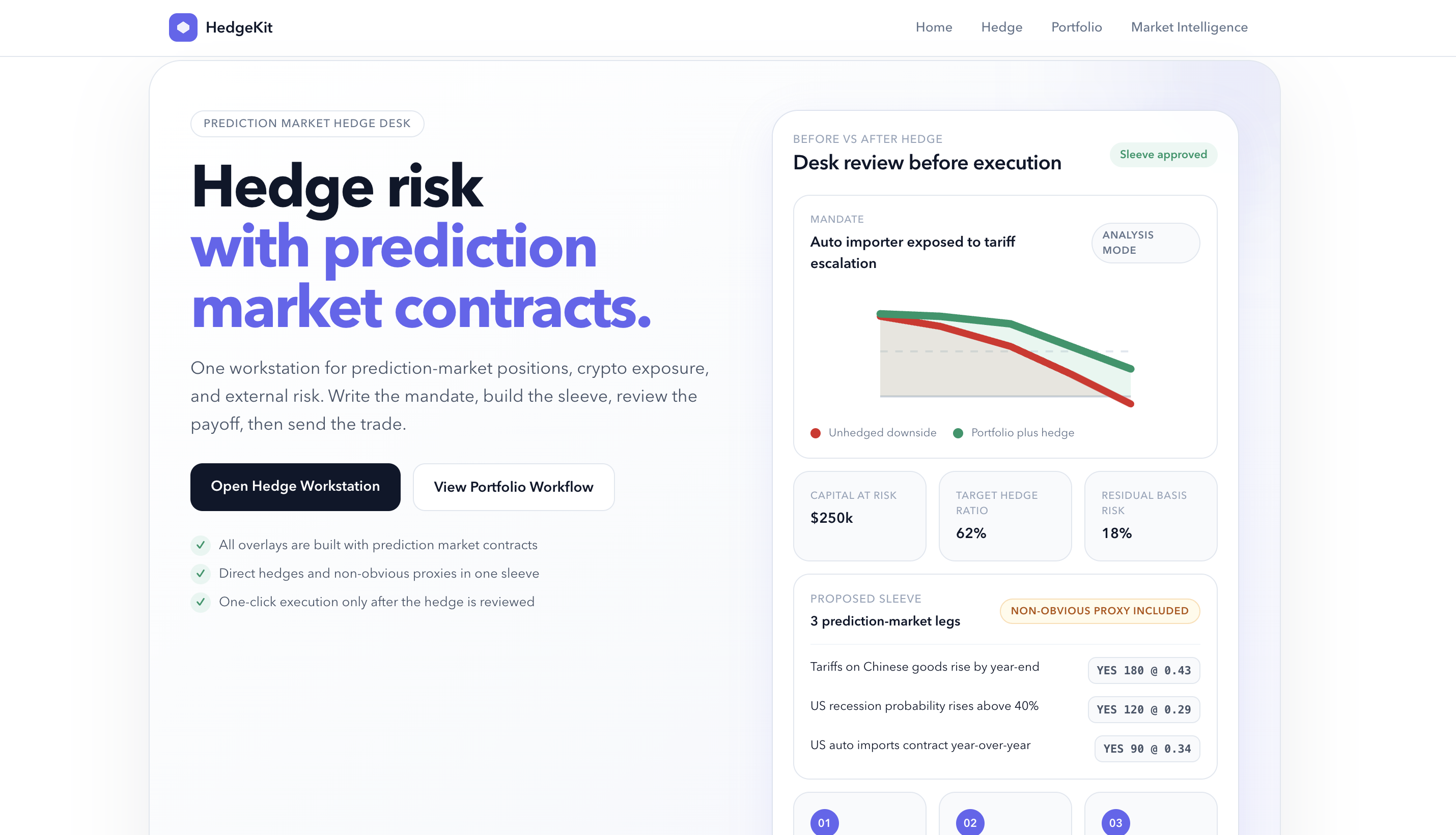 If someone is exposed to tariffs, elections, recession risk, or a concentrated prediction market position, they should be able to describe that exposure in plain English and immediately understand what contracts could offset it, why those contracts make sense, and how much protection they provide.