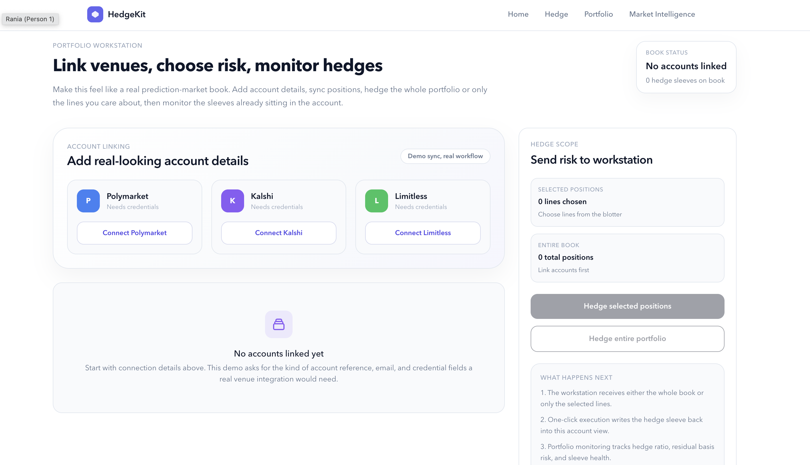 I’m also proud that the product became much more ambitious during the build. It started closer to a market intelligence tool, but evolved into something more compelling: a system that helps users turn real-world event exposure into actionable prediction-market hedges.