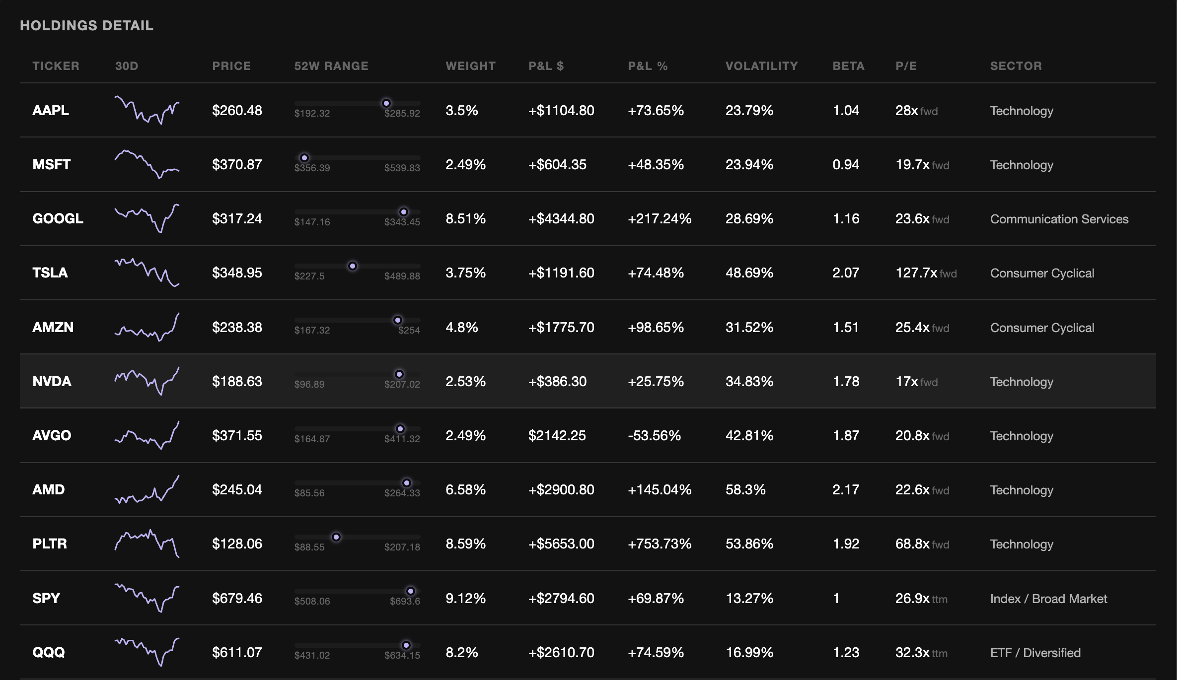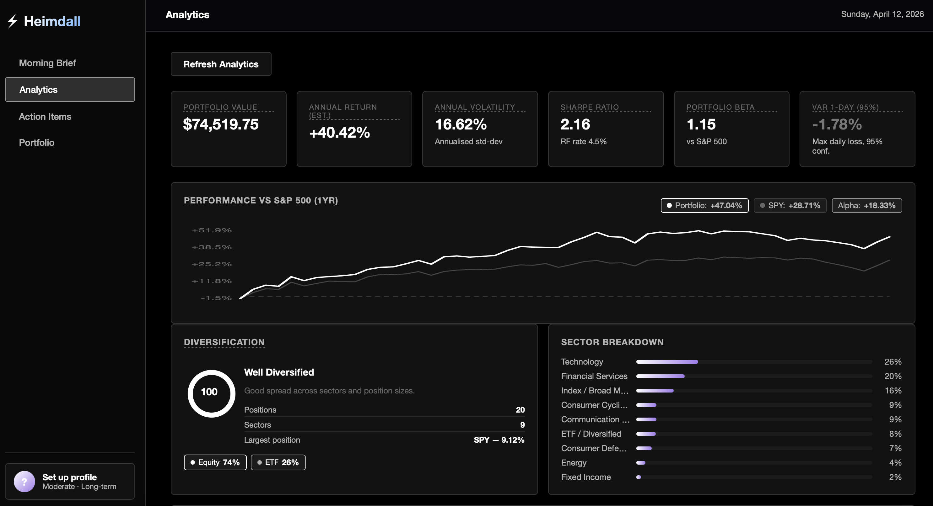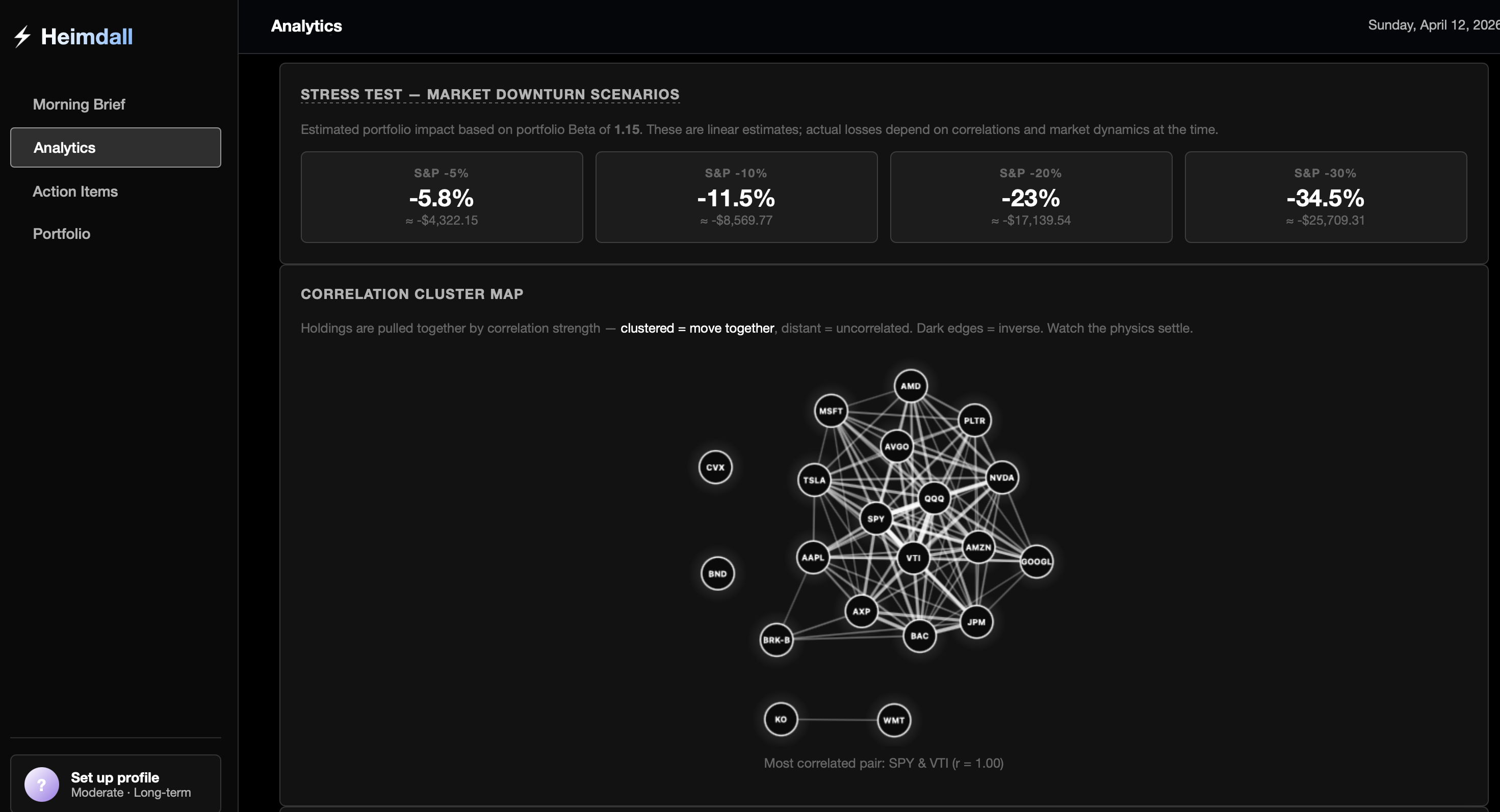 You put in your stock holdings and Heimdall pulls together the news, price data, risk metrics, and an AI-generated brief that tells you what is important across your portfolio. There's also a correlation map that shows how your holdings move relative to each other, so you can see whether you're diversified or just holding a bunch of autocorrelated assets.