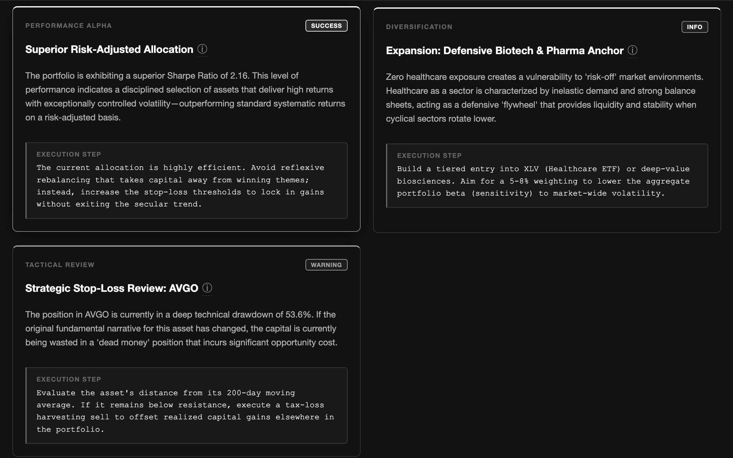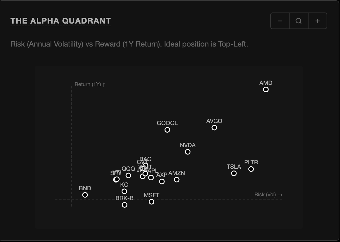 The correlation web came out better than we expected. It's a live physics-based graph that actually moves and responds and it looks nothing like what you normally see in finance apps. The morning brief also works in a way we're happy with, and it produces summaries that are relevant and high-impact. It turns out taking the live news and portfolio numbers and getting the LLM to synthesize something readable was harder than it sounds.