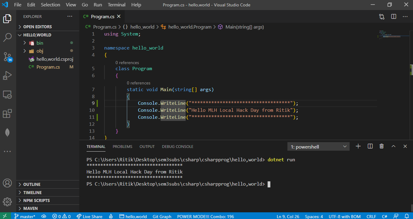 Console.WriteLine("Hello MLH Local Hack Day from Ritik");