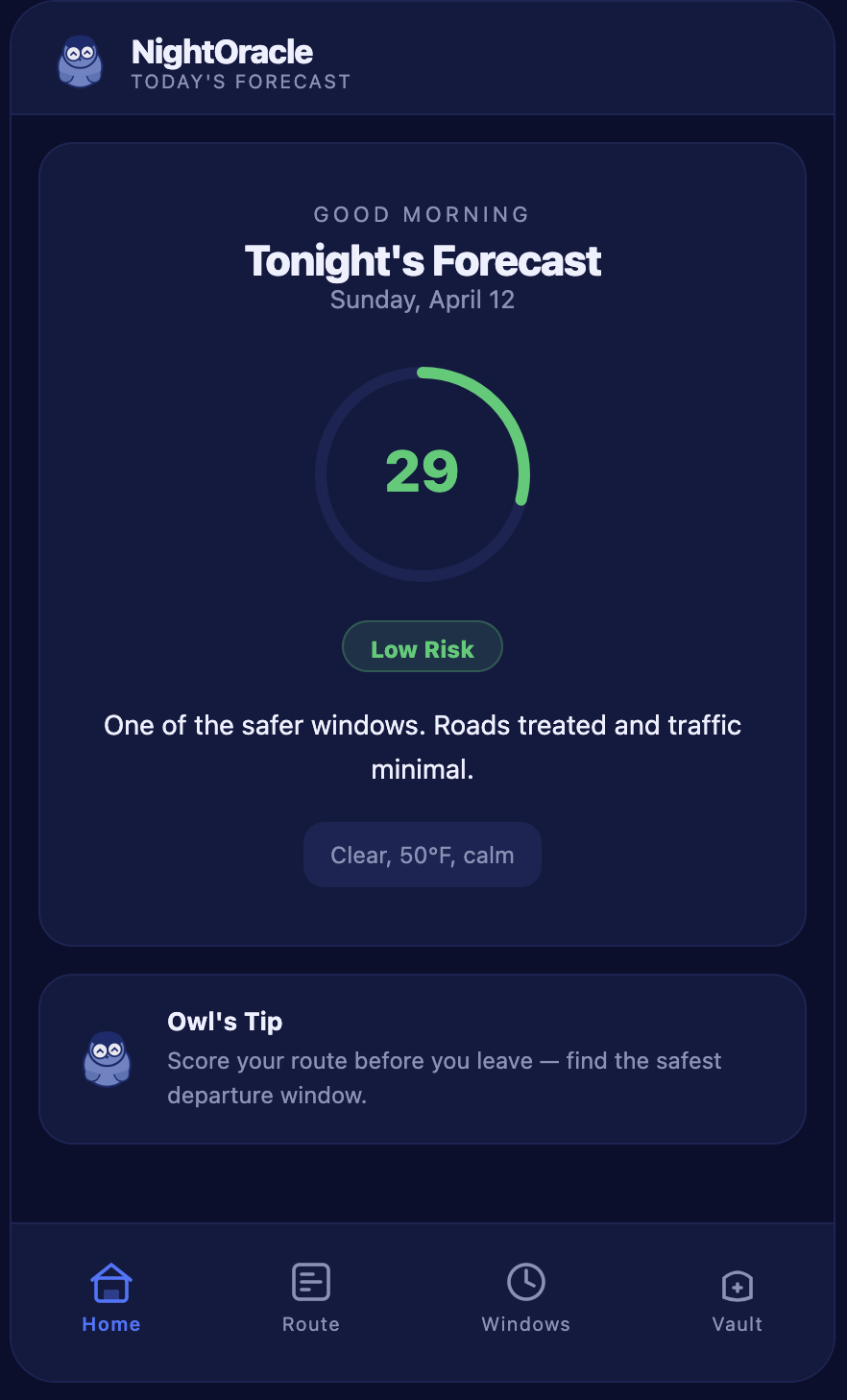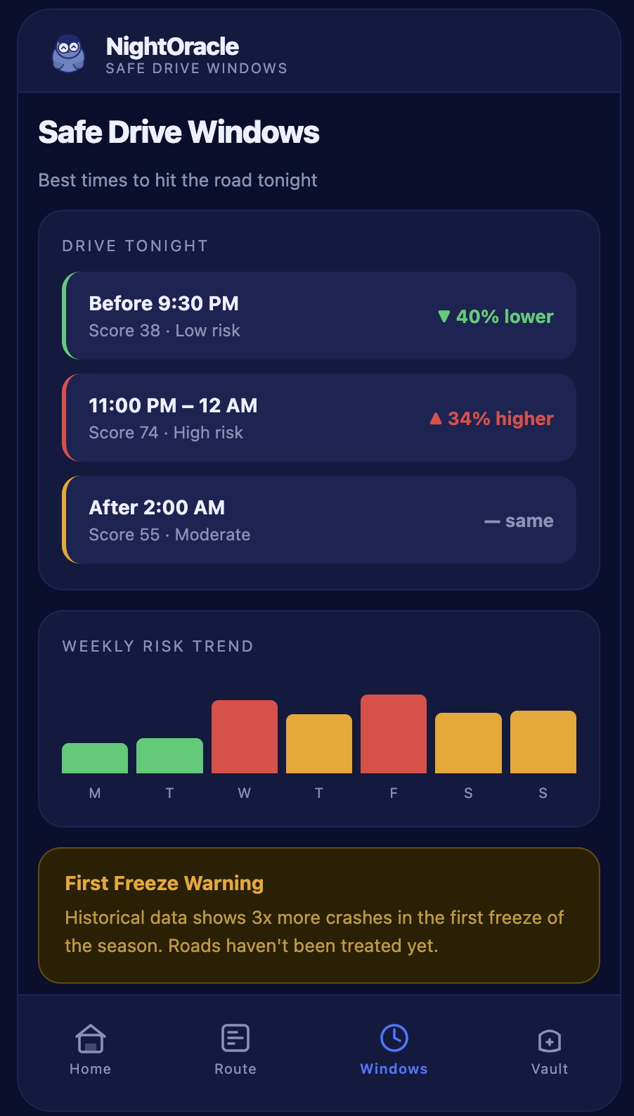 A safe departure window feature: "Leave before 10pm tonight conditions deteriorate after midnight and your risk score rises 40 points." The model can calculate this hourly; we just have not exposed it in the UI yet.