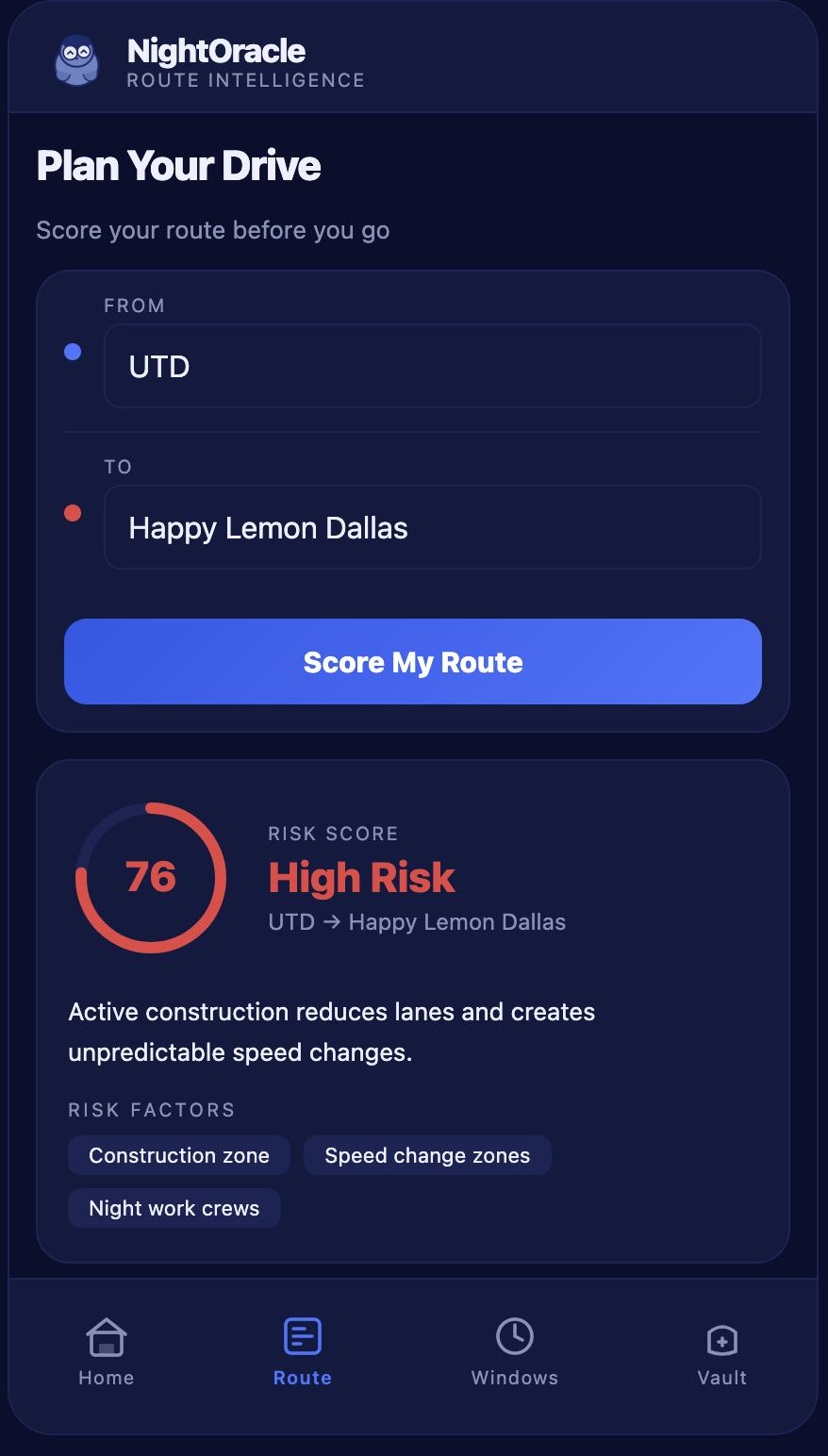 NightOracle is a real-time driving risk assessment that scores road conditions before you drive, not your behavior, not your history, just the environment around you right now.