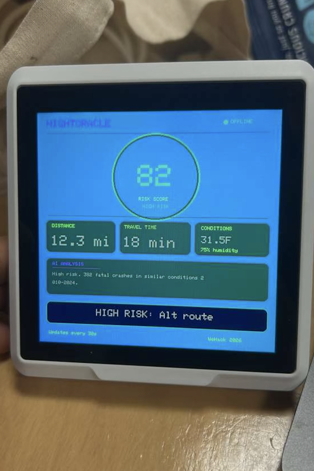 The SenseCAP Indicator reads live temperature and humidity. Our ML model is trained on 5 years of NHTSA fatal crash data and scores your route segment by segment from 0 to 100. Gemini translates the model's feature importances into a plain-English explanation that references actual local crash history: "382 fatal crashes happened in conditions like tonight's in Dallas County between 2010 and 2024."