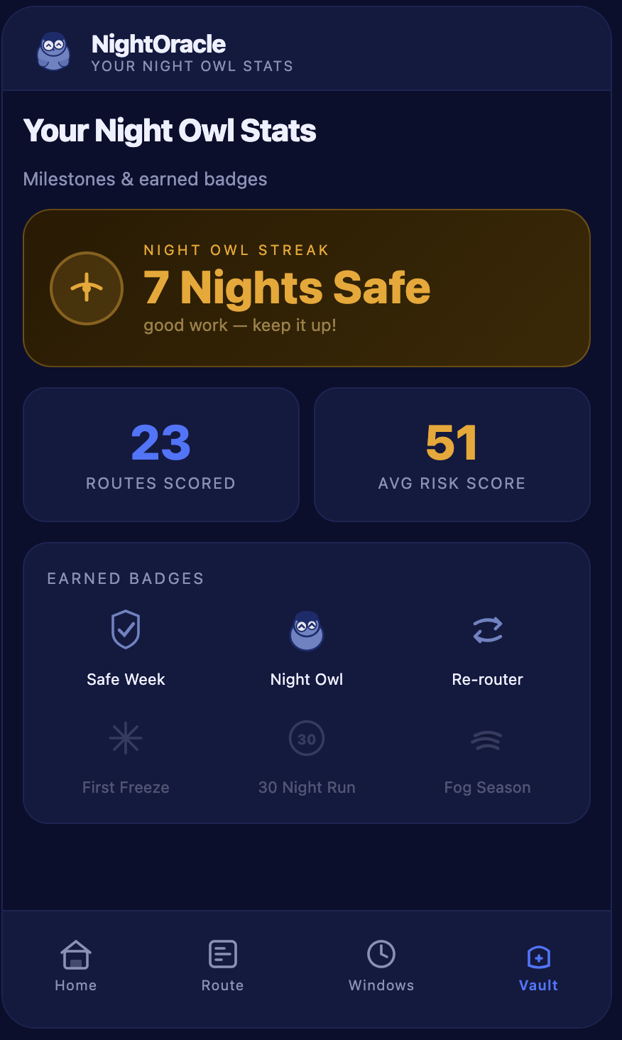 Longer term: if NightOracle ran passively in the background and nudged drivers toward safer time windows and routes over weeks, the aggregate claim reduction for an insurer would be measurable. That is the real product, not a single risk score, but a behavior change loop that compounds over a driving season.