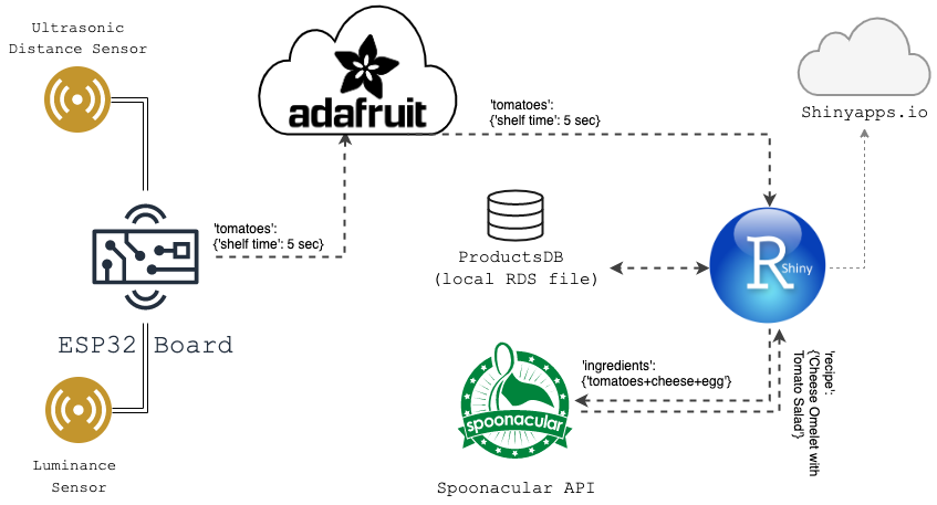 First of all, although we had some hardware at home, we didn't have weight sensors to keep the track of the different products in the shelf. So we had to get a little creative. Instead, we used a distance sensor, and a luminosity sensor. The distance sensor checks if there's something on the potato box. If the bag of potatoes is removed, the sensor will find no object in front of it, therefore reporting the box as "empty", and indicating that the potatoes are out of stock. As for the luminance sensor, we found out that when placing products on top of the tray, the small difference of ambient light of the surroundings was measurable. Thus, we used it to track if the tomatoes were out of stock. When removing them, the sensor detects an increase on the "lux", and indicates that the tray is empty. In any case, please consider that this is just a proof of concept, and we thought that this could serve at least to illustrate the use case.