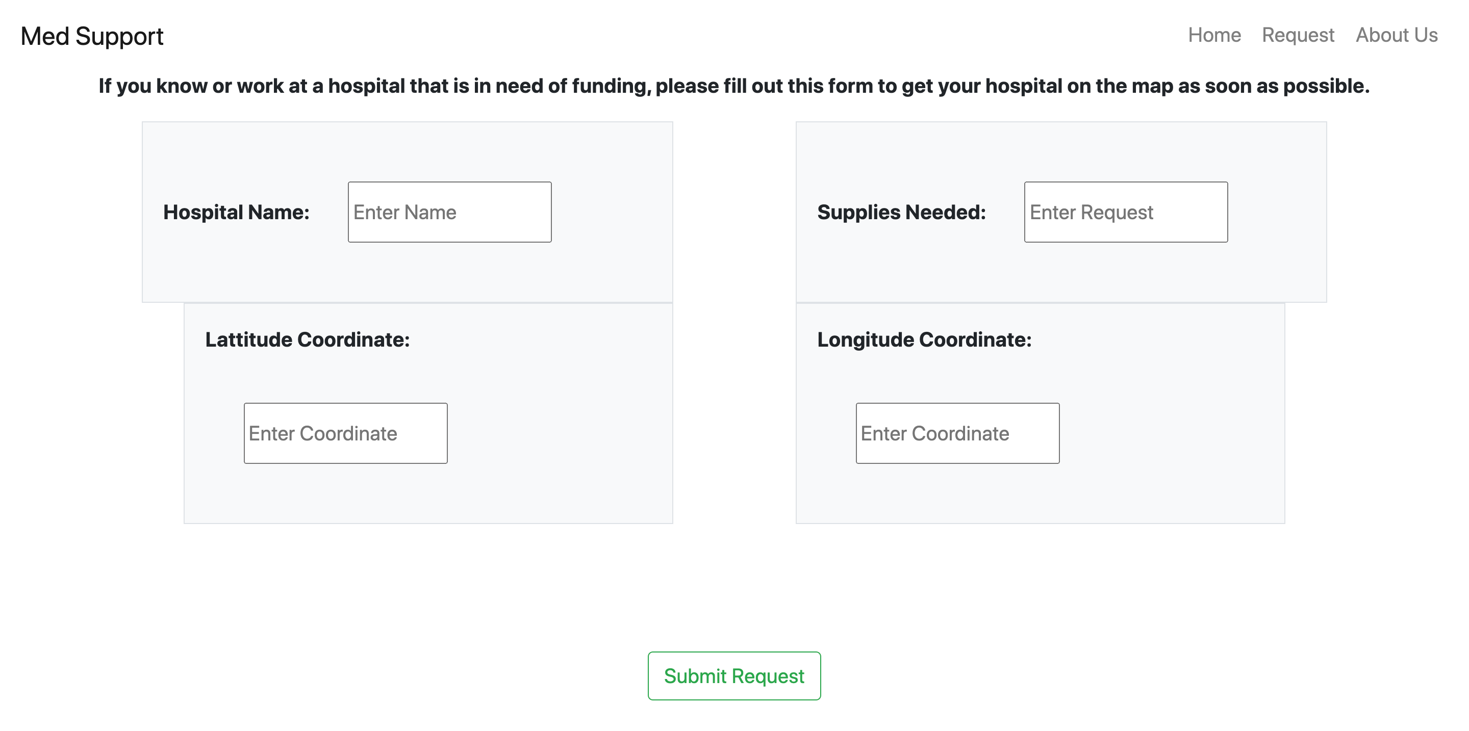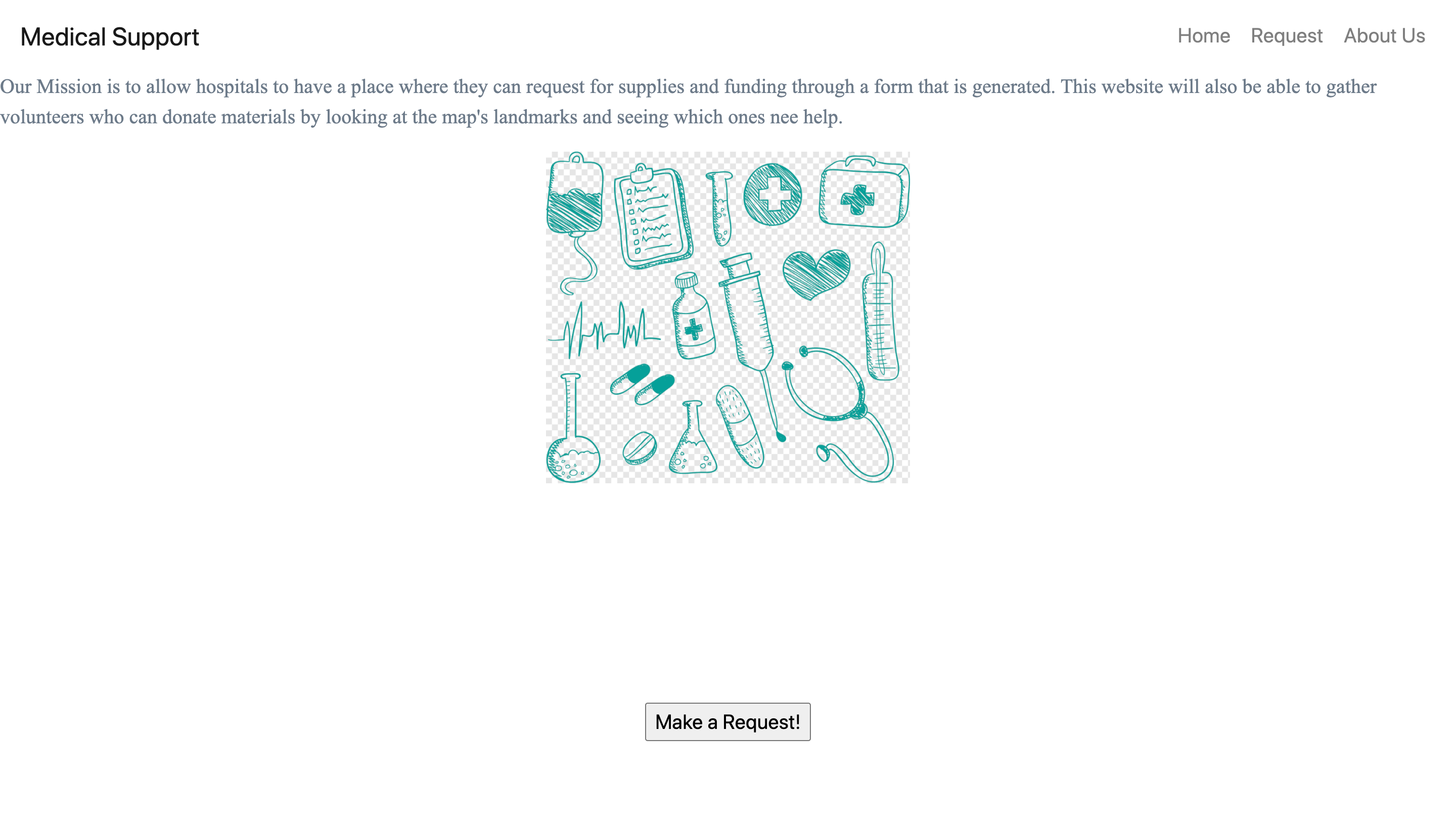 This website lets Hospitals request supplies and funding from around the world. Then we will process these requests and manually add the location of the hospital on the users maps and be referenced on the map as an area to donate to. This will allow the user to know what hospitals in their area need supplies and funding so the user can donate.