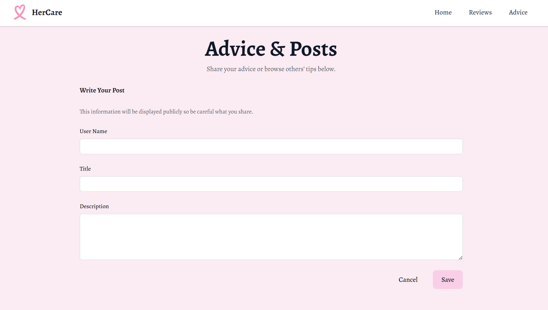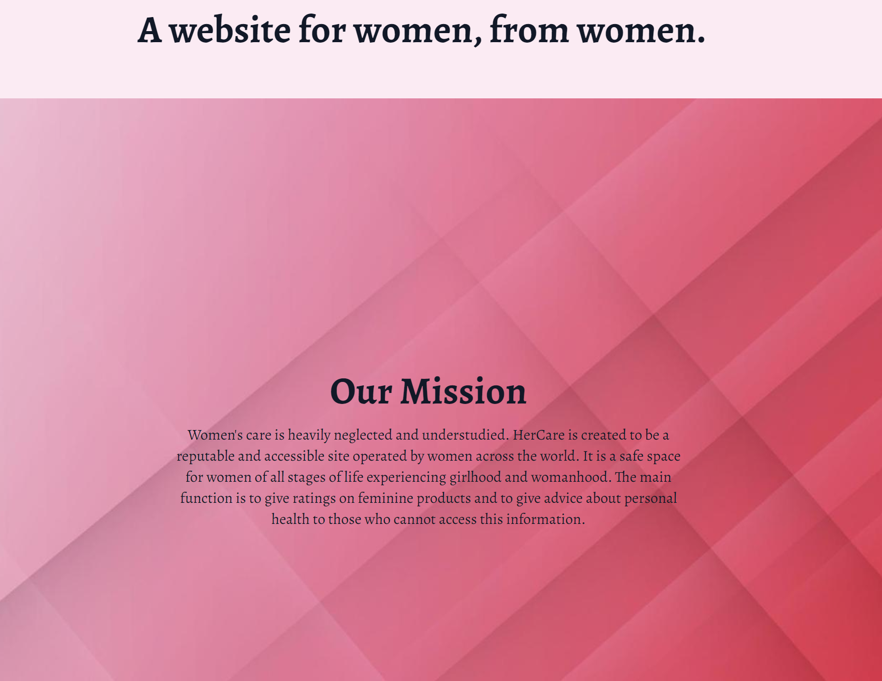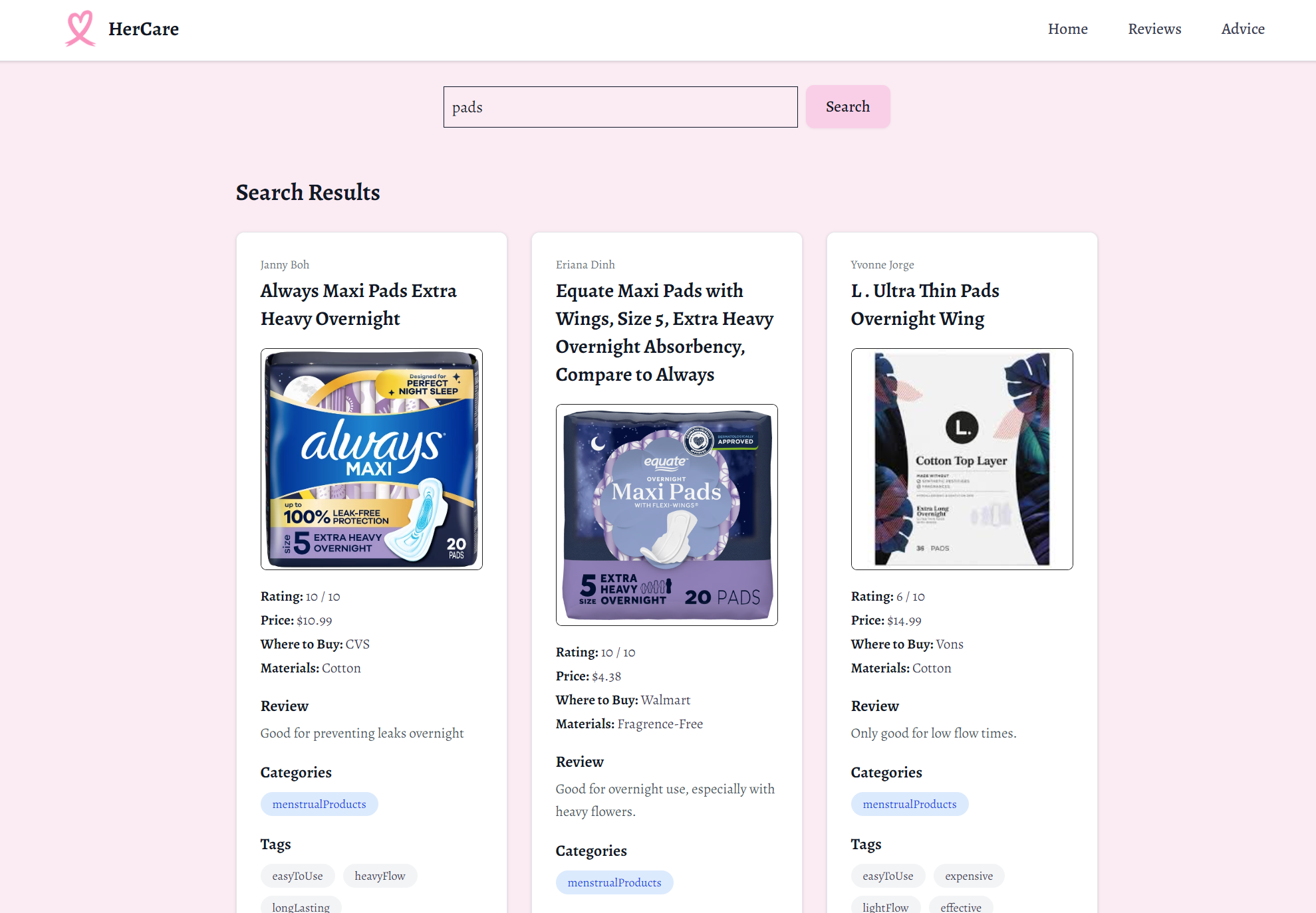 Women’s healthcare is notoriously neglected and understudied. We wanted to create a website where women can support other women through feedback, reviews, and information on feminine products. You can also post threads to give advice/ ask for advice which makes women of all ages connect.